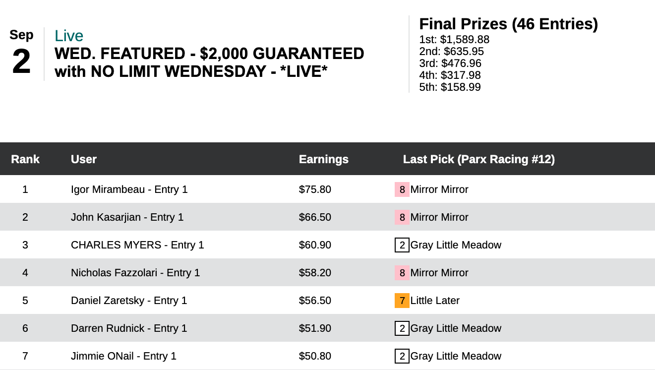 Igor Mirambeau was rewarded with $1,589 after coming up with 4 wins and 2 places in Wednesday’s $2,000 Guaranteed game, which closed with a purse of $3,179. Mirambeau particularly loved his handicapping in the final three tourney races. He won them all, including with Mirror Mirror ($15.40, $9.20) in the 12th at Parx.
