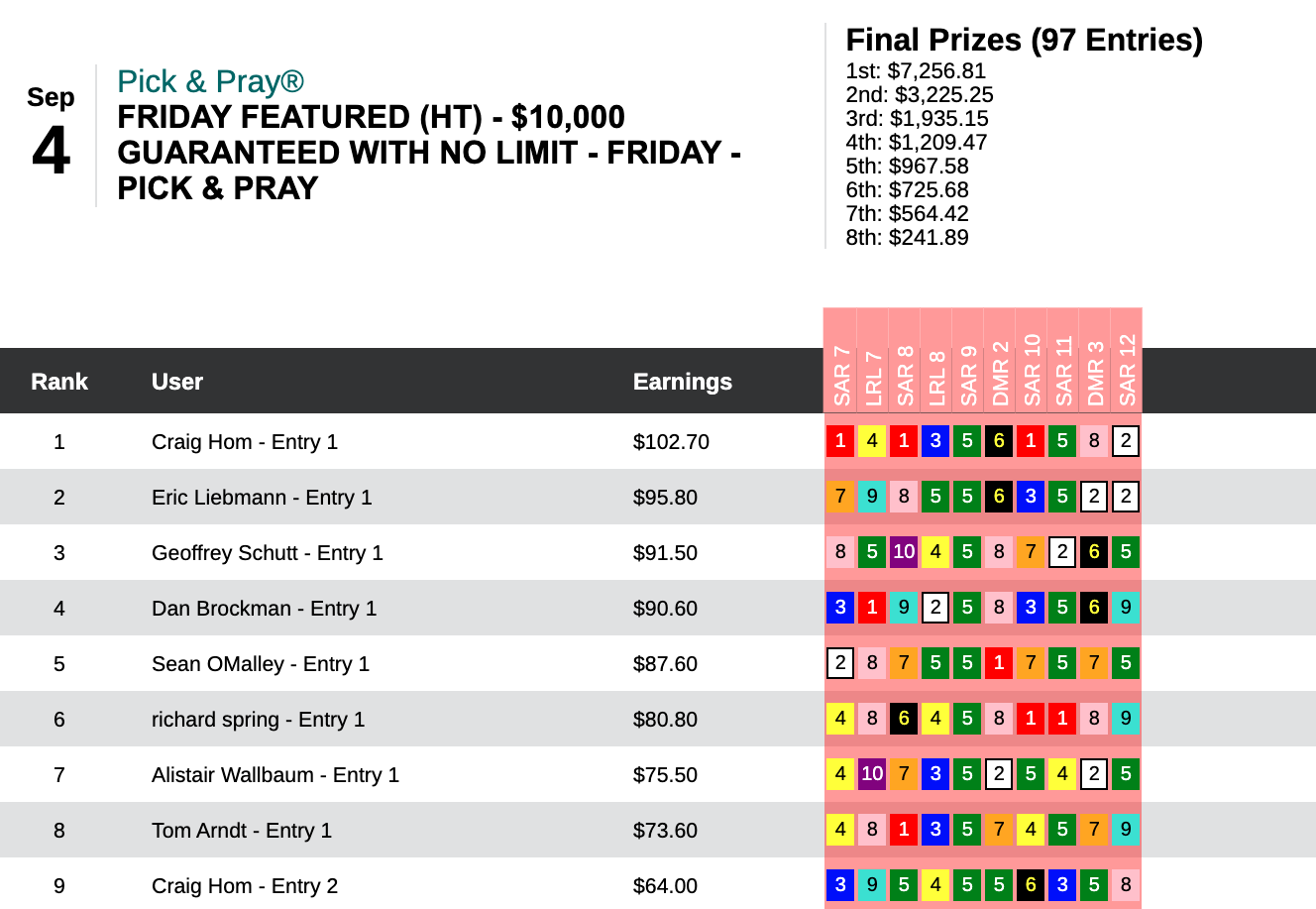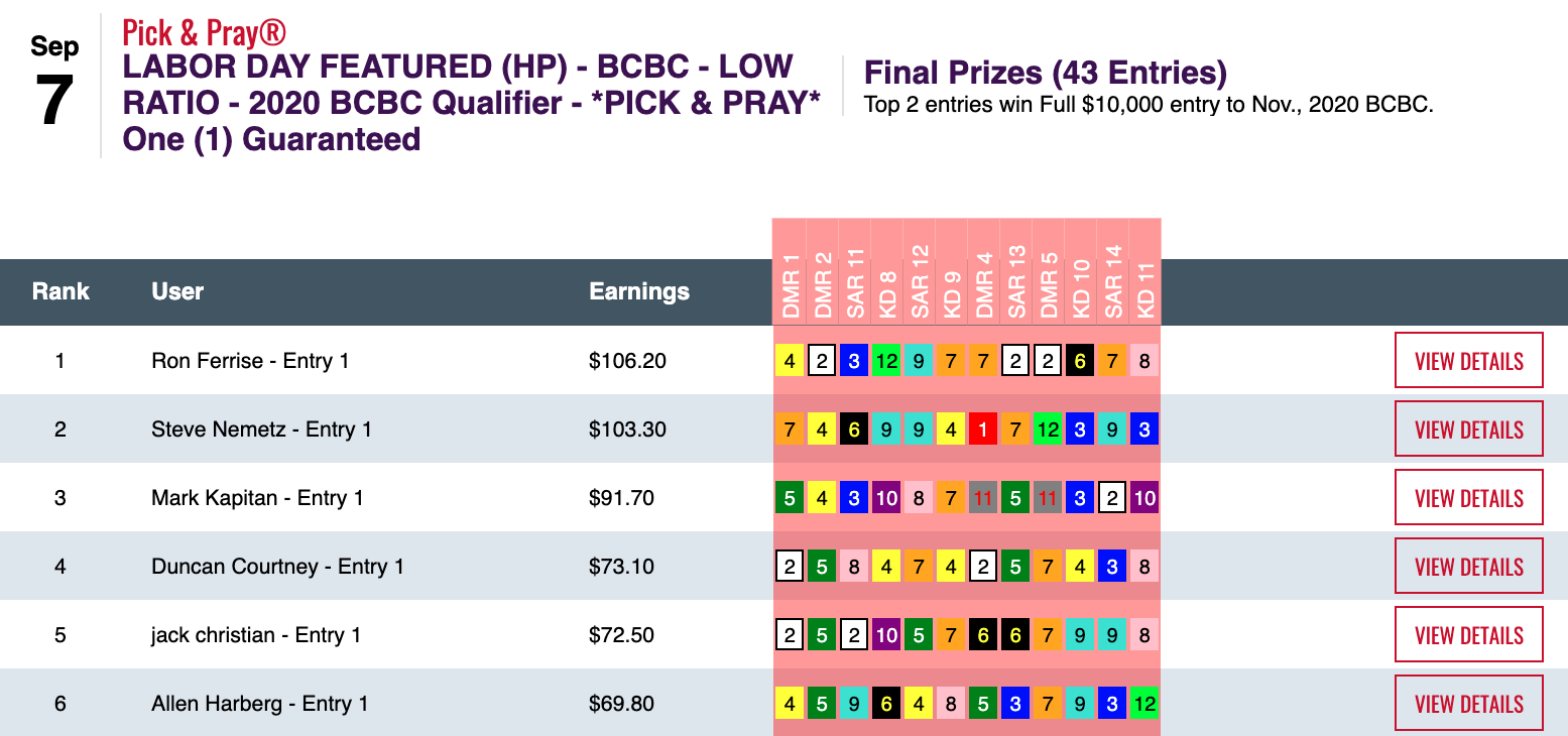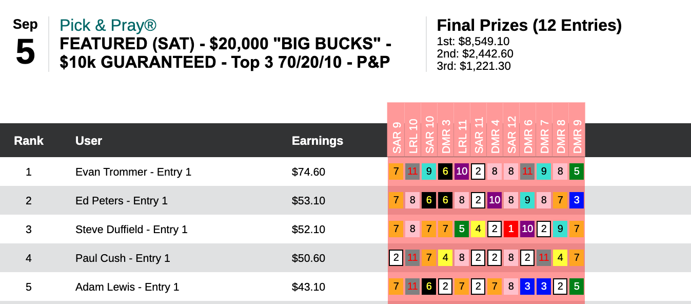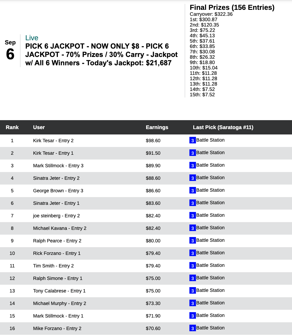 Six days earlier—on August 29th—Hom used a 16-1 winner at Del Mar as the knockout punch during a 5-win, 2-place day that earned him $13,253 in a $29,000 game. On this day, it was the Saratoga “Hom Bomb” that paired nicely with two other winners and four runners up. Hom’s haul here was $7,256—the winner’s share in our $10,000 Guaranteed Pick & Pray, which had a final pot of $16,126.