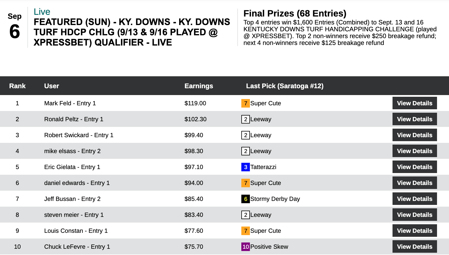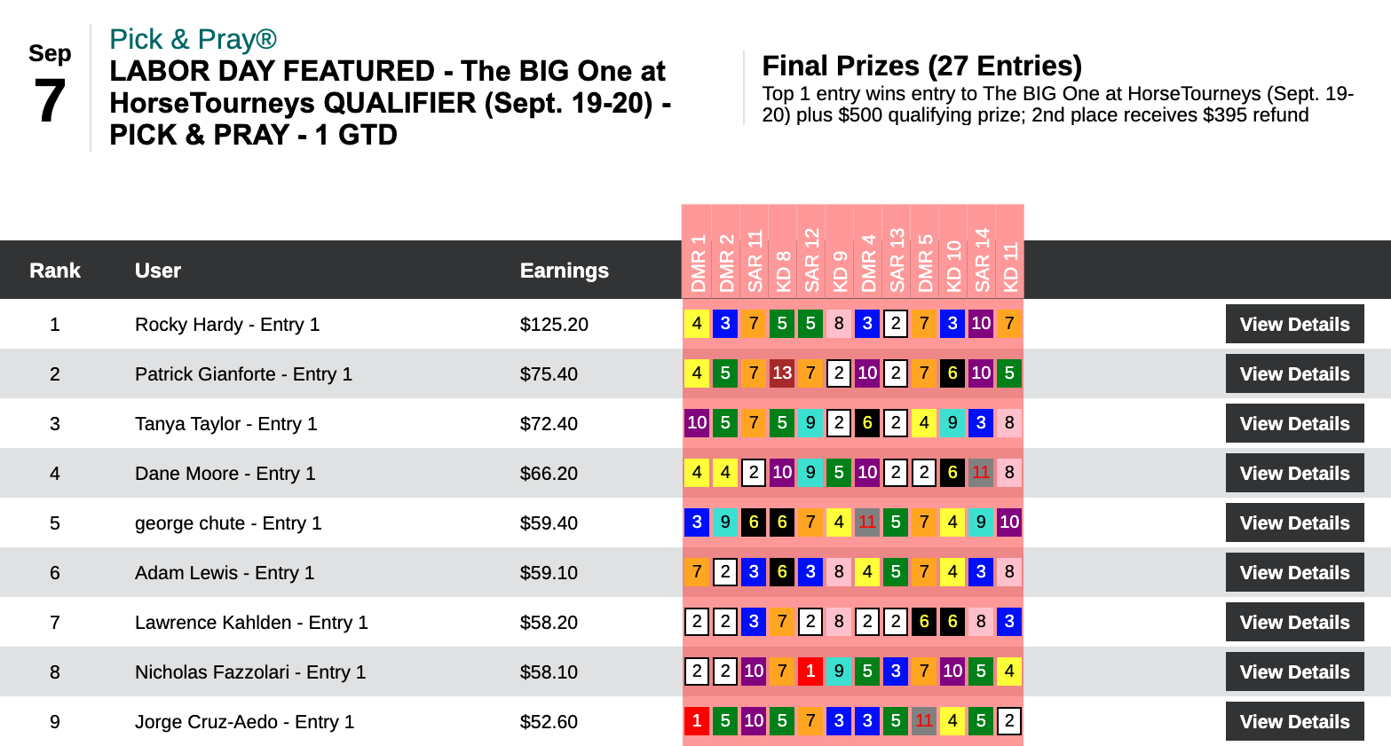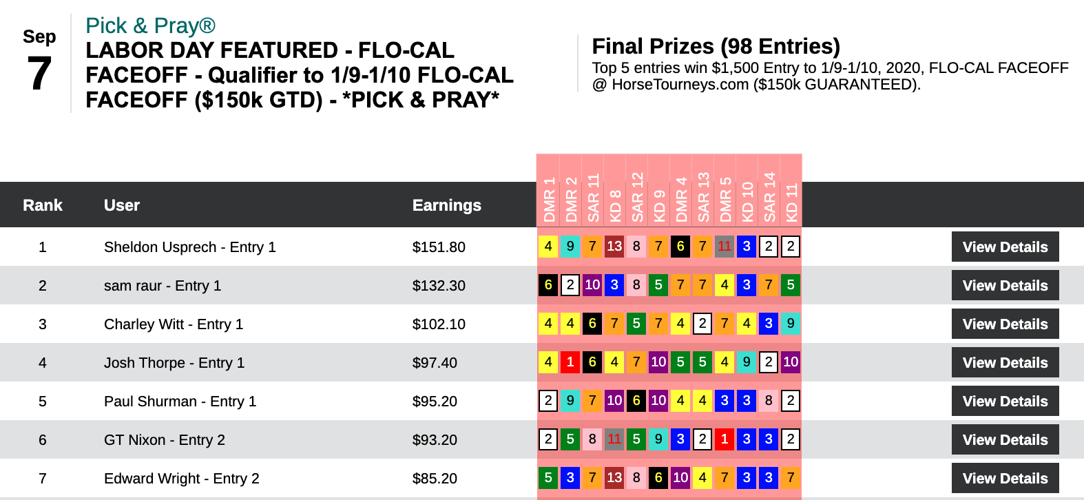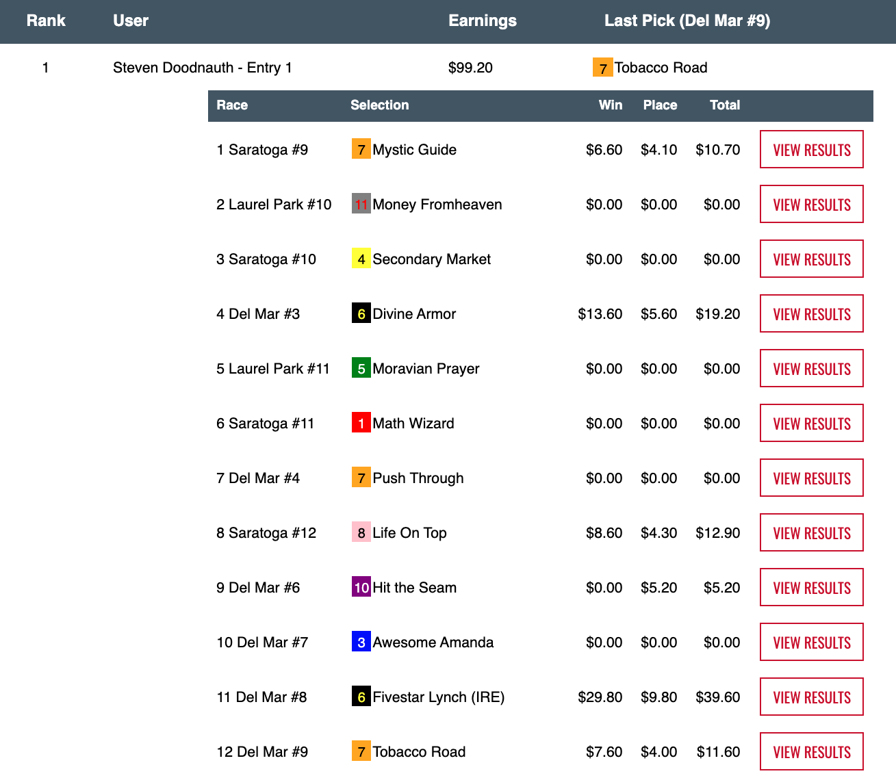 Six days earlier—on August 29th—Hom used a 16-1 winner at Del Mar as the knockout punch during a 5-win, 2-place day that earned him $13,253 in a $29,000 game. On this day, it was the Saratoga “Hom Bomb” that paired nicely with two other winners and four runners up. Hom’s haul here was $7,256—the winner’s share in our $10,000 Guaranteed Pick & Pray, which had a final pot of $16,126.