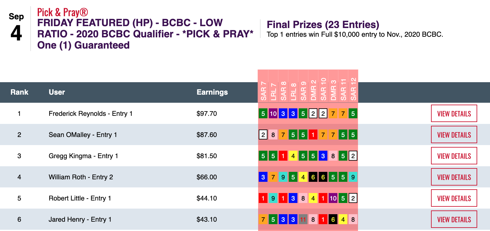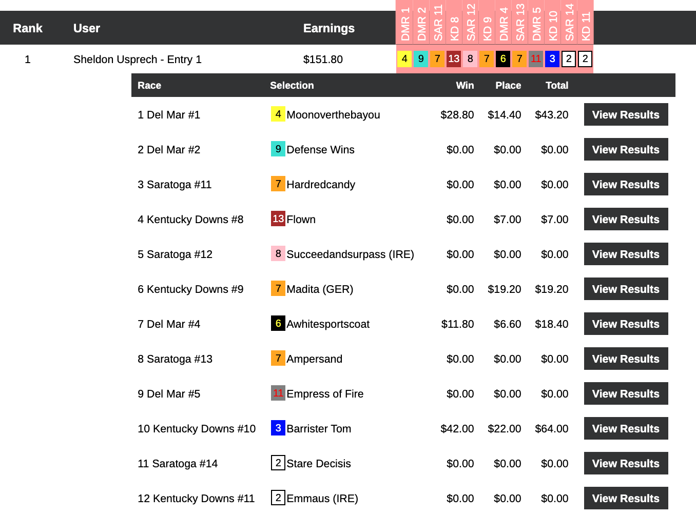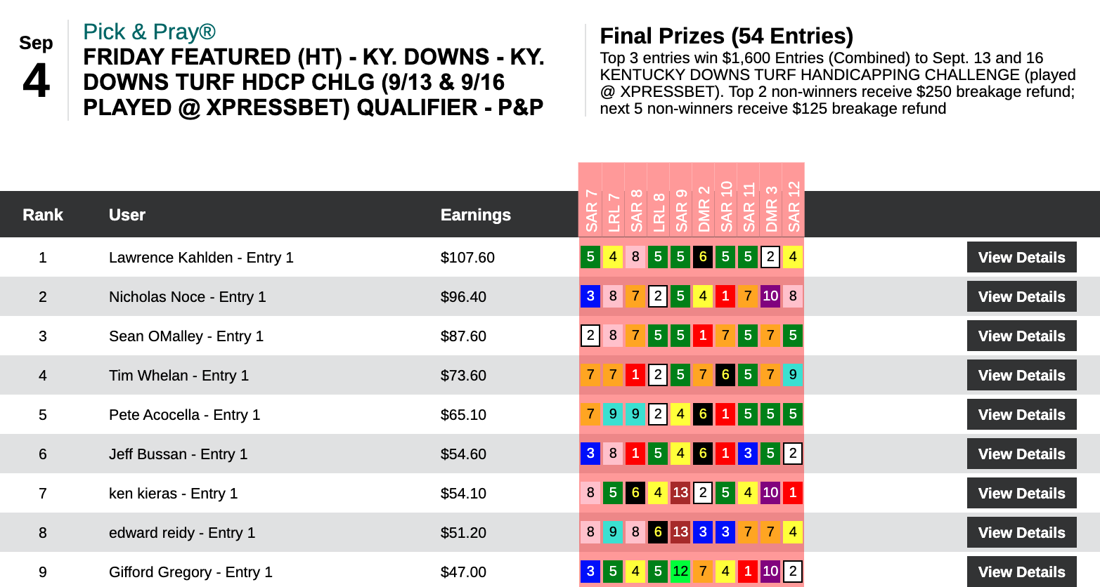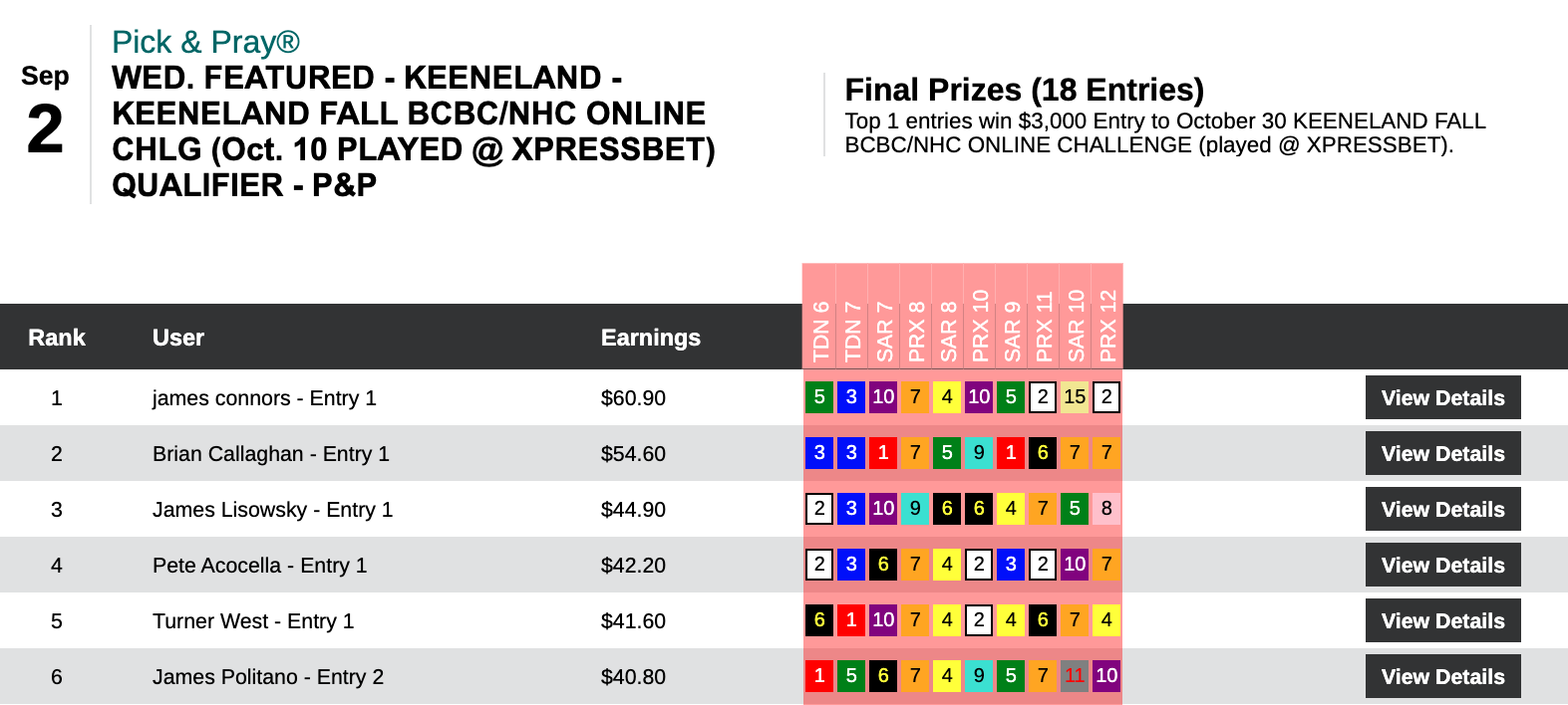Six days earlier—on August 29th—Hom used a 16-1 winner at Del Mar as the knockout punch during a 5-win, 2-place day that earned him $13,253 in a $29,000 game. On this day, it was the Saratoga “Hom Bomb” that paired nicely with two other winners and four runners up. Hom’s haul here was $7,256—the winner’s share in our $10,000 Guaranteed Pick & Pray, which had a final pot of $16,126.