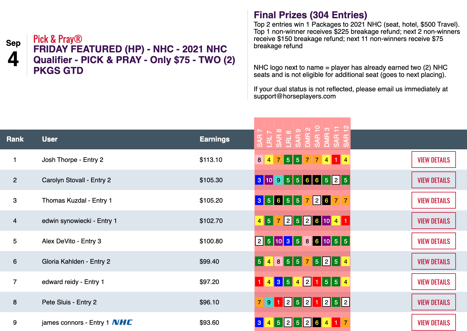 Josh Thorpe and Carolyn Stovall were the big winners in Friday’s $75 NHC qualifier at HorsePlayers.