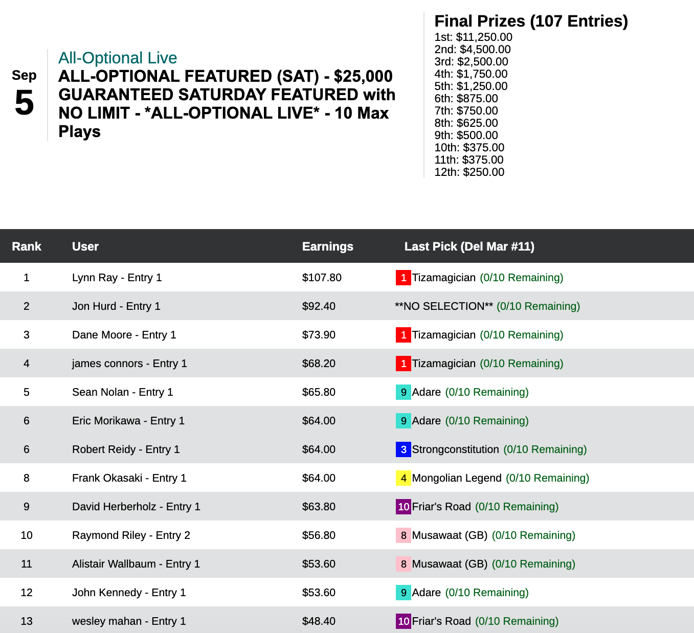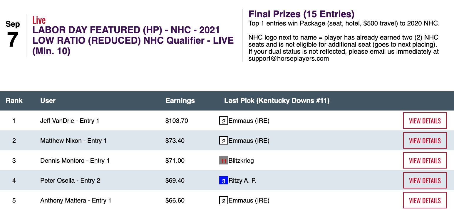 Jon “Hurricane” Hurd led much of the way in our $25,000 Guaranteed All Optional Live event, but Ray connected with Tizamagician ($24.00, $9.60) in the last race to claim the top prize of $11,250 for herself. Hurd settled for a not-too-shabby $4,500.