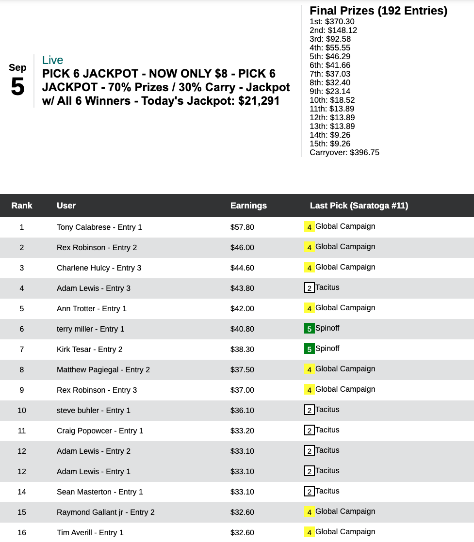 Tony Calabrese (4 winners) came out best in the end of Saturday’s $8 Pick 6 Jackpot tourney.