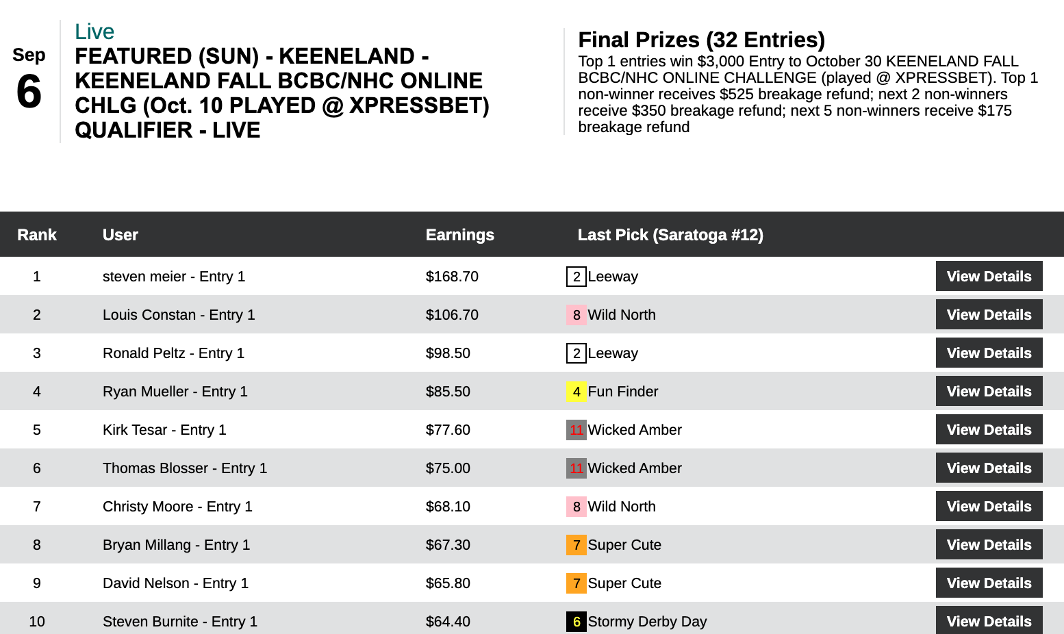 Stovall bagged her “Bally’s Berth” with 2 wins and 2 places. Thorpe had the day’s high score with 4 wins and 2 places. His day unfolded this way: