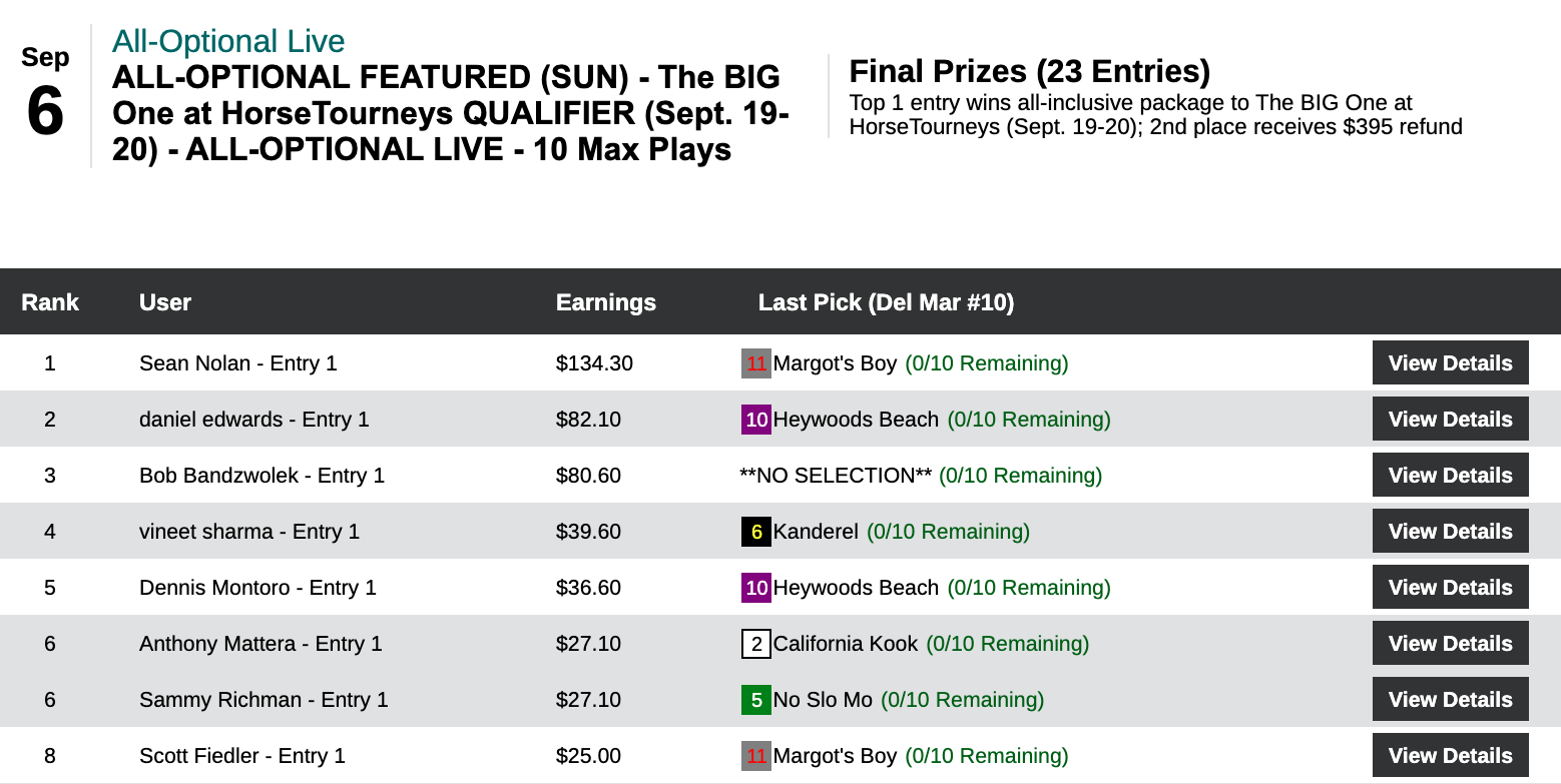 Here Nolan added a $10.60 place payoff to his three double-digit-odds winners to land a spot in the September 19-20 “high expectation” tourney.