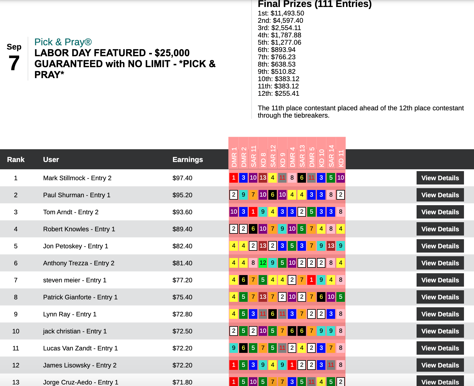Monday’s richest tourney, our $25,000 Guaranteed Pick & Pray, was captured by Mark Stillmock.