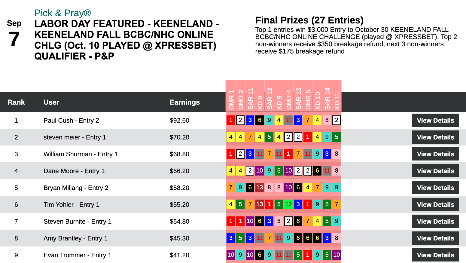 Cush didn’t hit anything that went off greater than 7-1, but his total of 4 wins and 2 places led to a $22.40 triumph—good for a $3,000 entry on October 10.