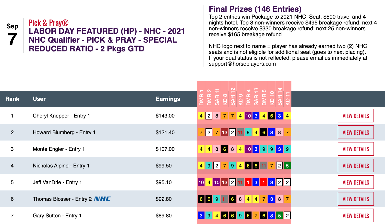 Knepper led the way with a score of $143.00—built on 5 wins and 1 place—to earn a Reduced Ratio (1-per-52) NHC seat along with runner up Howard Blumberg (3 wins, 1 place).