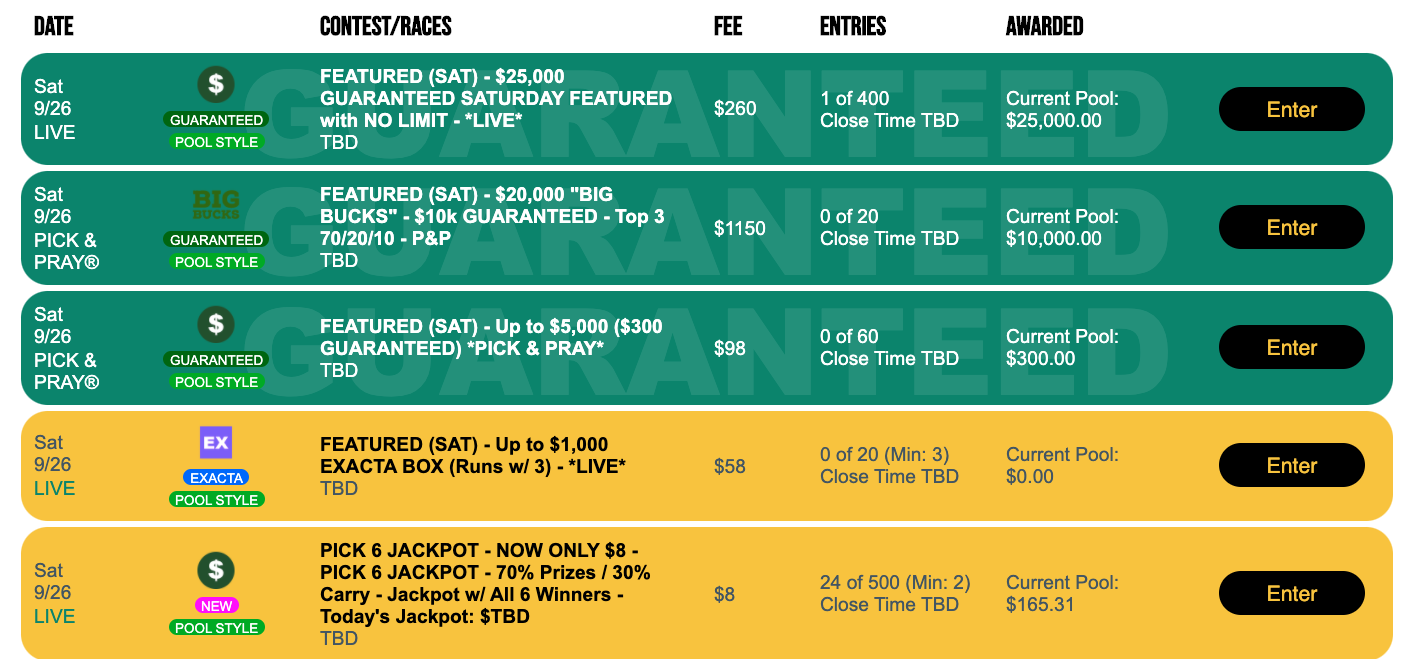 There are six featured tourneys on Saturday. We’ll start with the HorsePlayers slate because that one contains the game that the majority of you should all be playing.