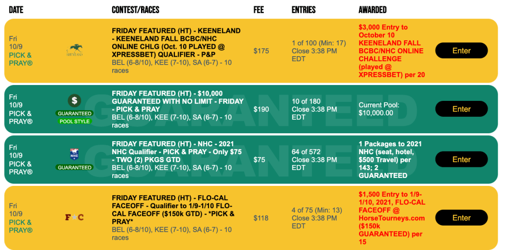 TGIF day is your last chance to earn a $3,000 entry to Saturday’s Keeneland Fall NHC/BCBC Online Challenge, which will be hosted at Xpressbet. The entry fee for this 1-per-20 Pick & Pray is $175.