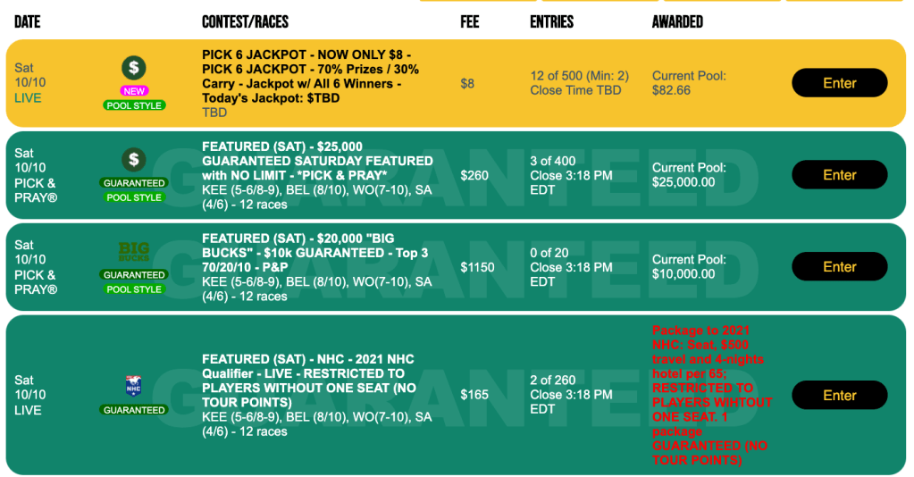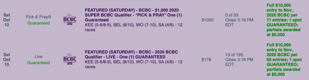 There’s also Saturday’s $10,000 Guaranteed Big Bucks Pick & Pray. The entry fee is a not-insignificant $1,150, and the field is limited to 20, unless there are late entries due to last-minute feeders. As always with Big Bucks events, payoffs go only to the top three finishers—on a 70%/20%/10% basis.