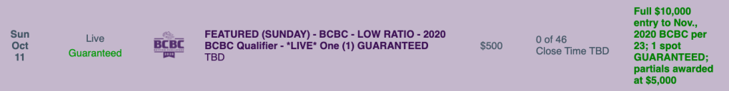 Saturday’s “regular” BCBC qualifier has one grand prize guaranteed and carries an entry fee of $179. It’s a live-format tourney with a winning ratio of 1-per-65.
