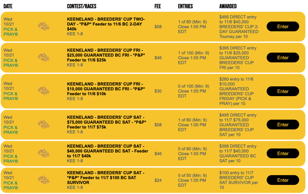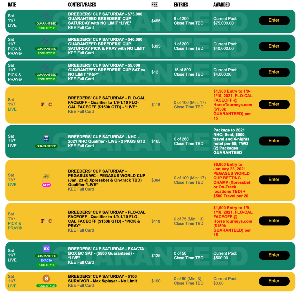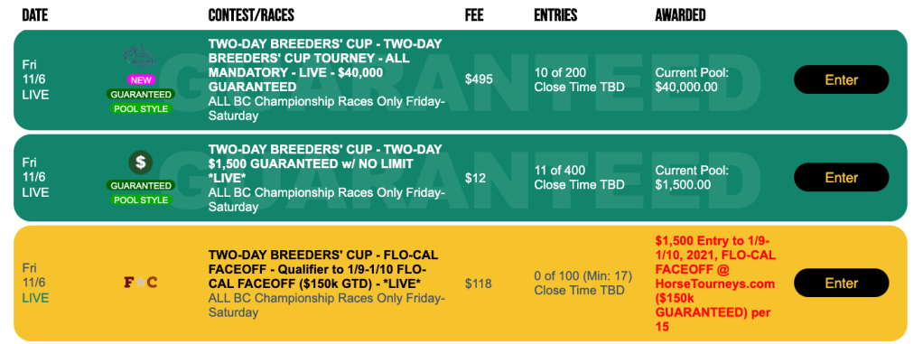 We have several Friday-only tourneys and several Saturday-only ones as well, but we also have four two-day competitions that cover the 14 Breeders’ Cup championship races over the course of Friday (5) and Saturday (9).