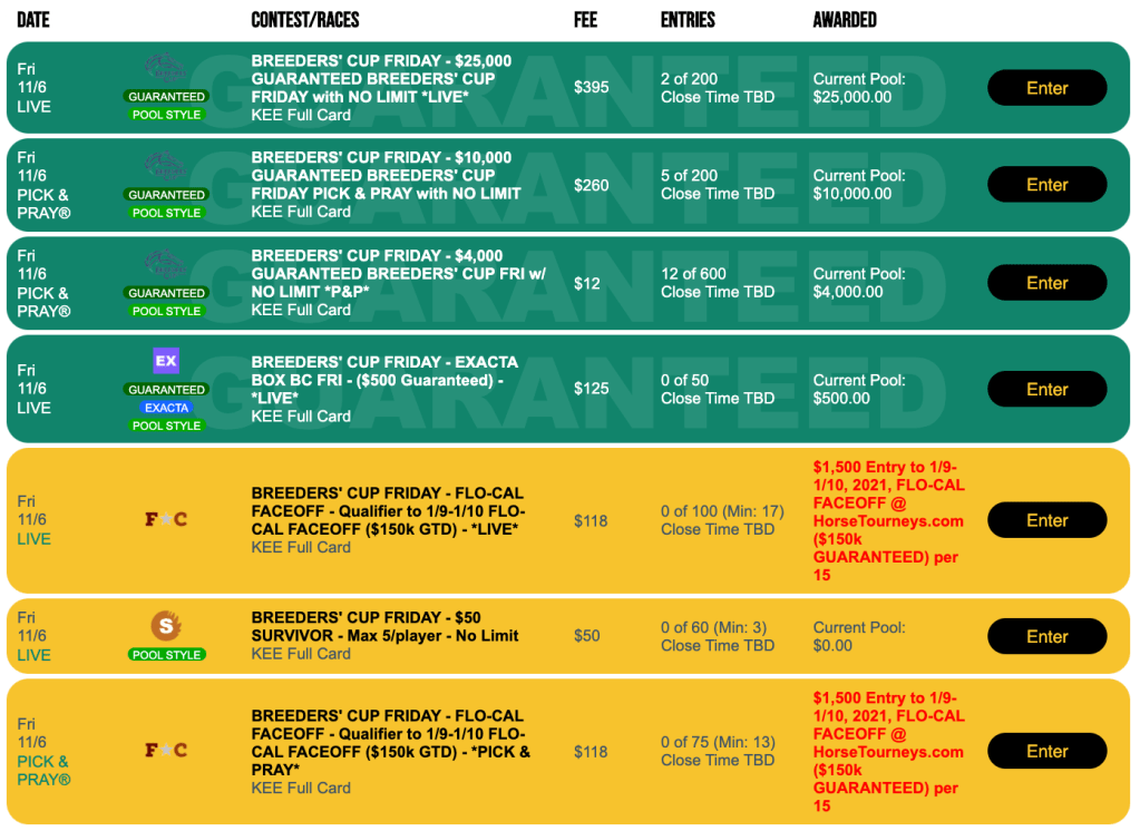 There are seven “Friday only” tourneys on the board (with possibly more to come). Note that these seven games will be decided on the full card of racing at Keeneland on November 6.