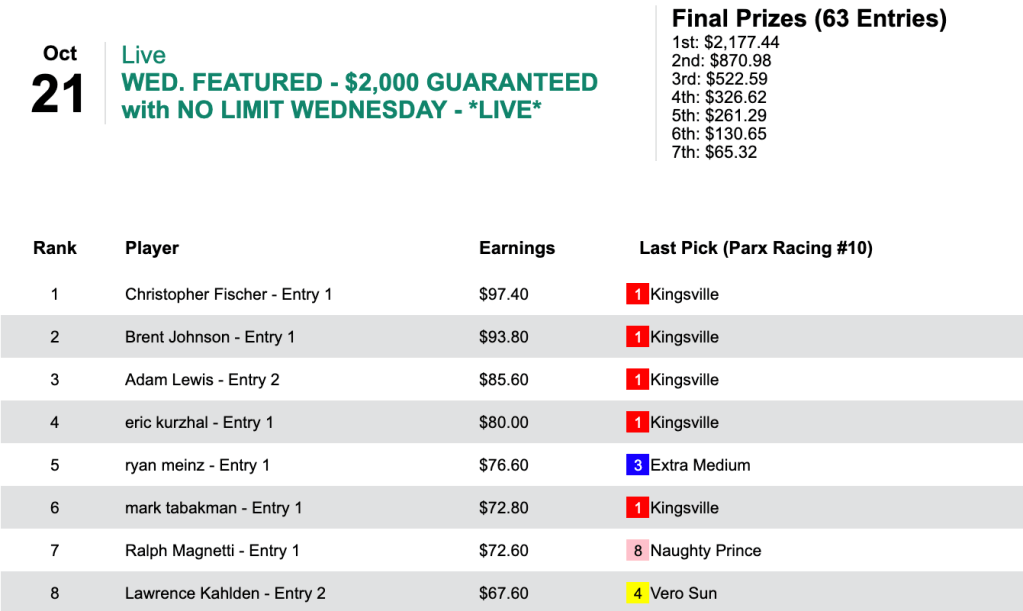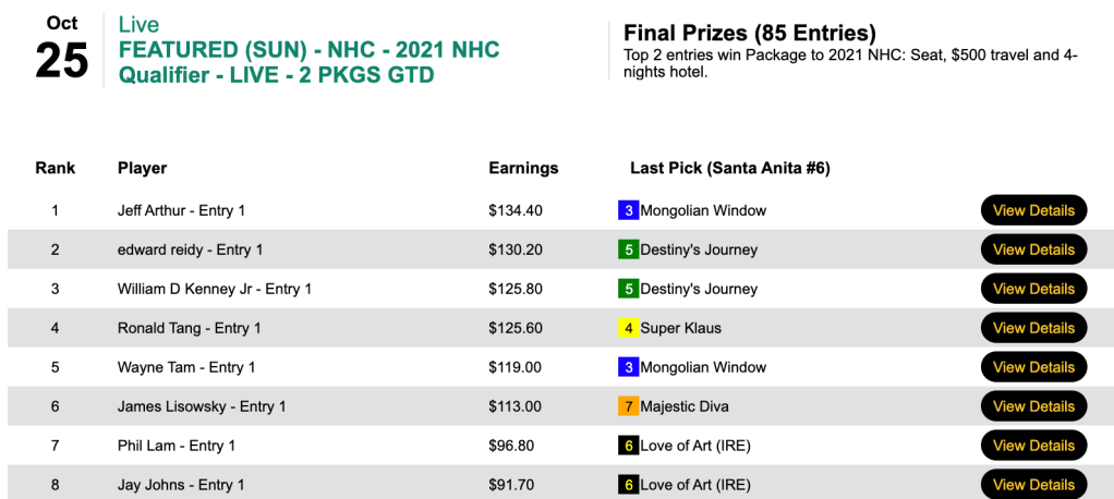 There were lots of featured tourneys last week—lots of Breeders’ Cup Betting Challenge qualifiers, especially (7)—and lots of winners. The excitement got under way on Wednesday.