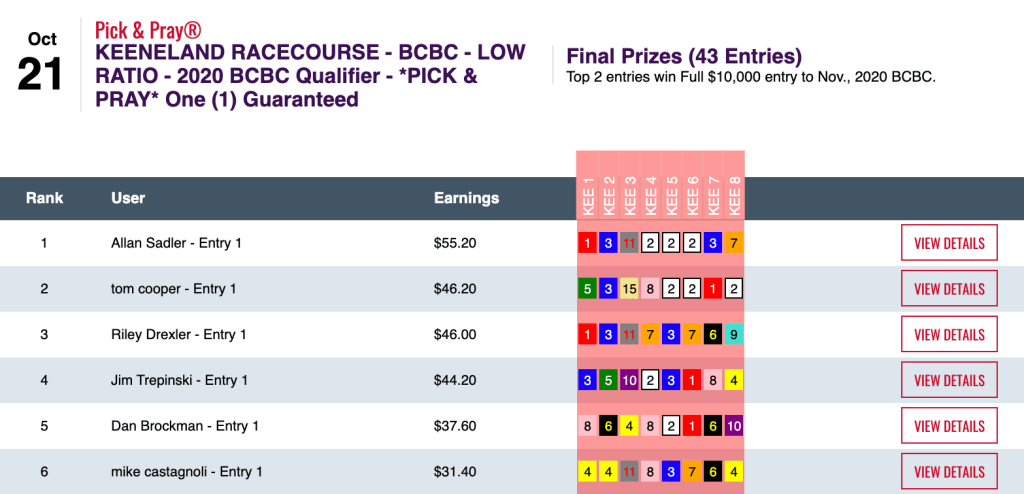 Despite there being just 43 entries in this 1-per-23 qualifier, we tossed in a second grand prize, Allan Sadler and Tom Cooper wound up being the first two of 11 BCBC entry winners at HorsePlayers during the week. Sadler accumulated 4 firsts and 1 second. Cooper (5 wins, 1 place) nailed the 2-1 winner of the Keeneland nightcap to edge out Riley Drexler for the second $10,000 entry by just 20 cents.