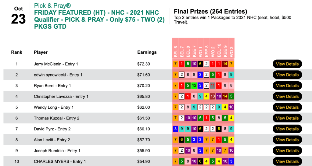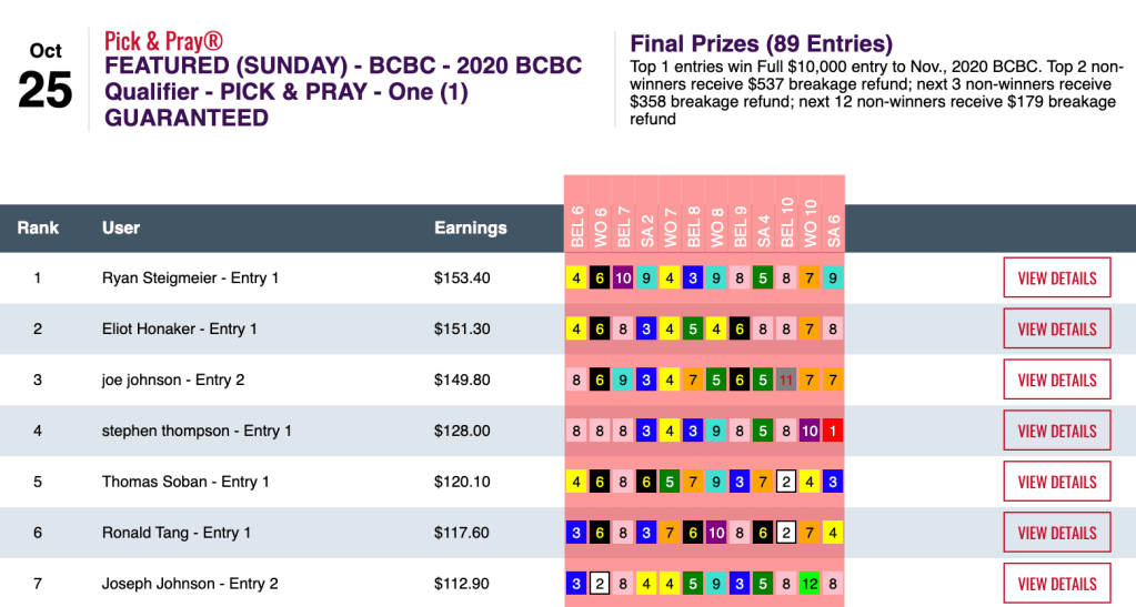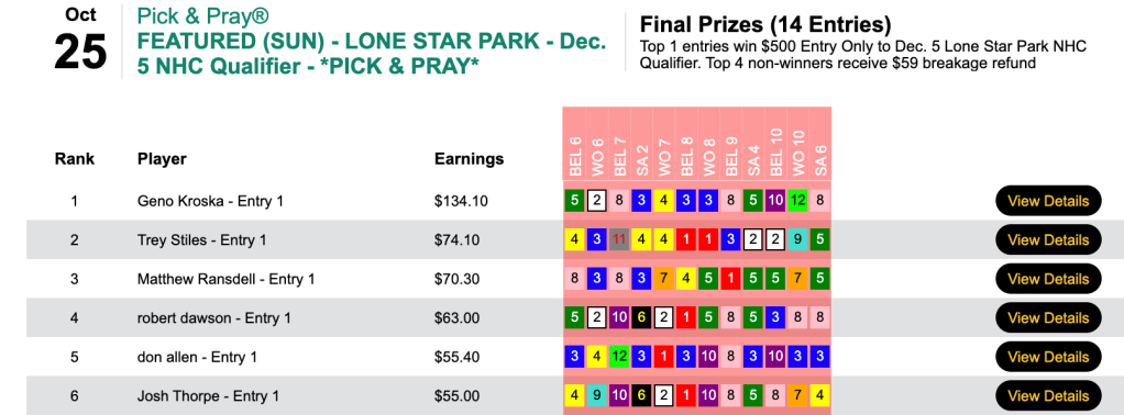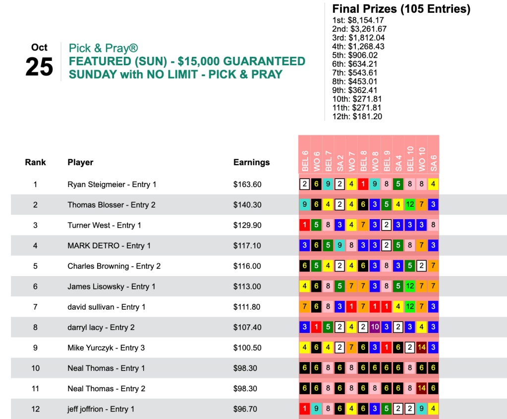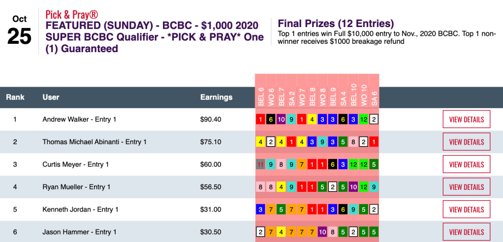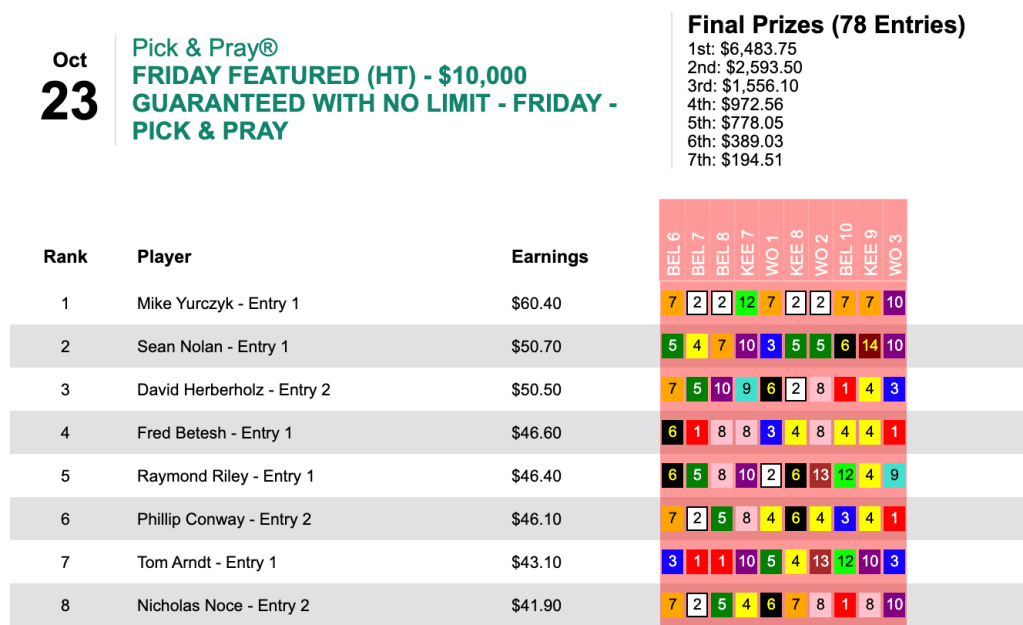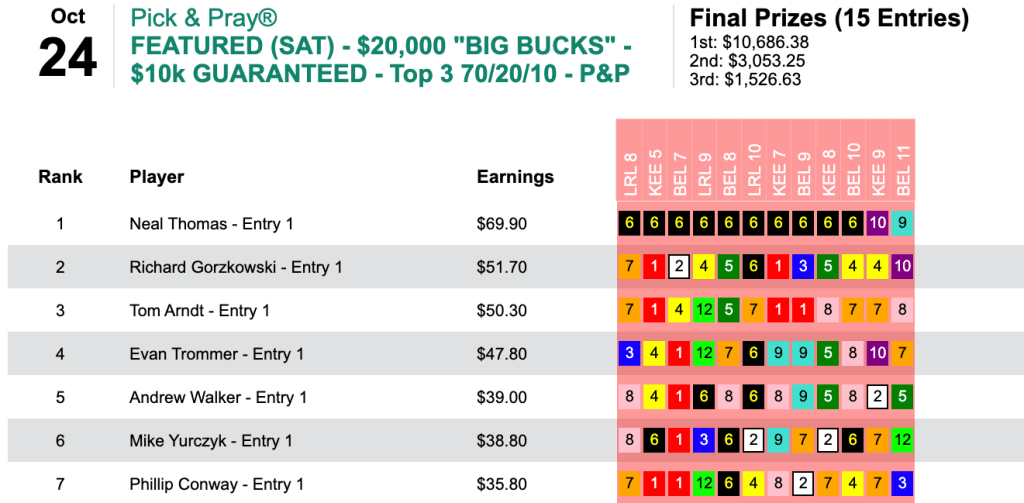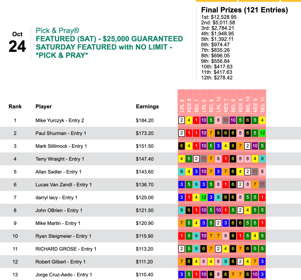 Apparently it doesn’t matter to Yurczyk whether a day is chalky or filled with prices. On Saturday he tripled his Friday score—and almost doubled his cash winnings, collecting $12,528 in our $25,000 Guaranteed Pick & Pray, which ended up with a pot of $27,842. Here, Yurczyk had 6 wins and 2 places that led to Saturday’s highest score.