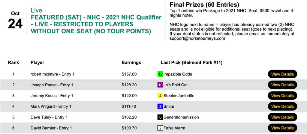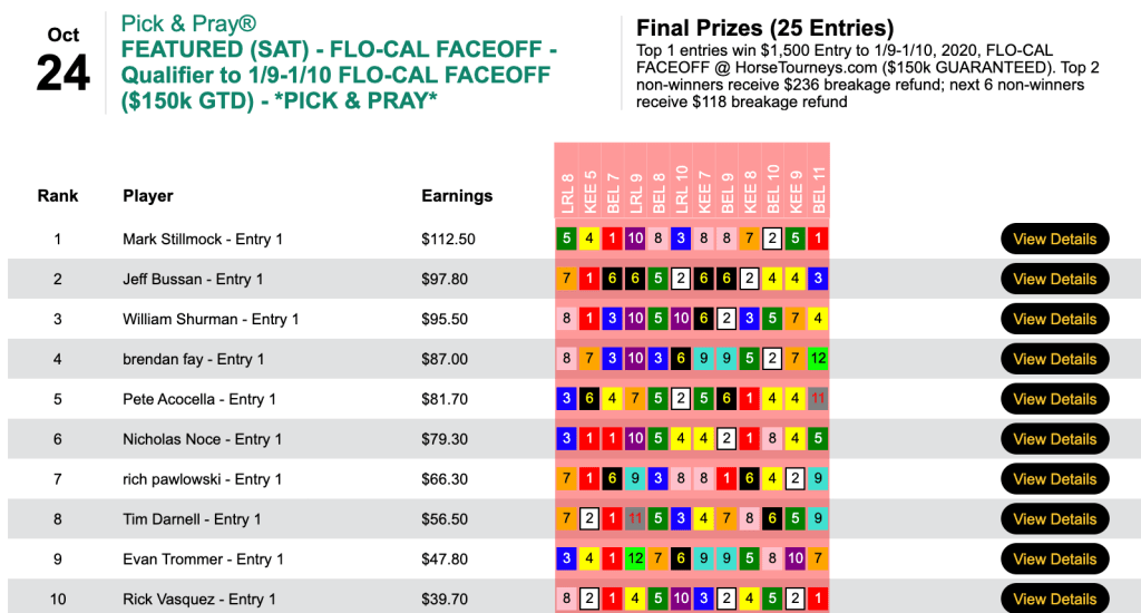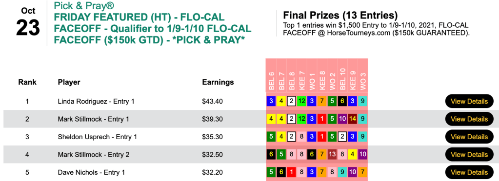 Happily, the vast majority of our featured tourneys didn’t leave us in the red, and that means the HorseTourneys Accounting staff will allow me to again chronicle the featured winners seven days from now. May you make next week’s blog!