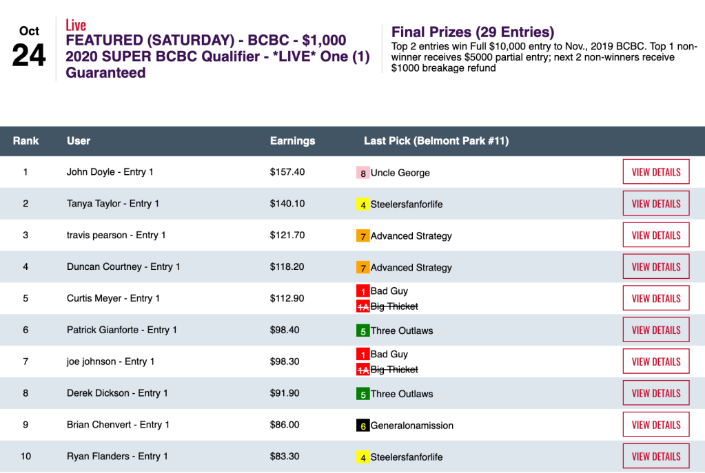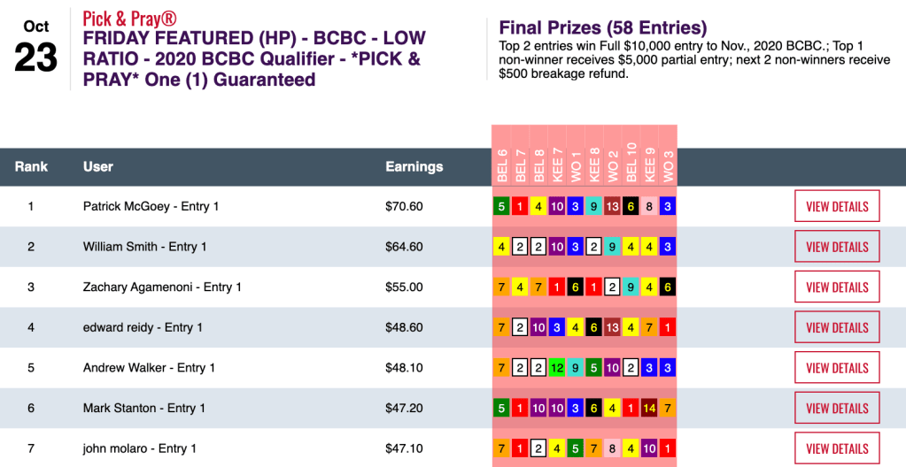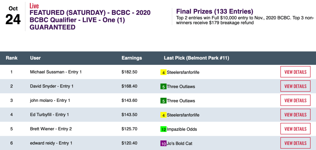 Steigmeier’s victory came in one of three BCBC qualifiers hosted by HorsePlayers on Sunday. The $500 Low Ratio play-in was taken by Turner West.