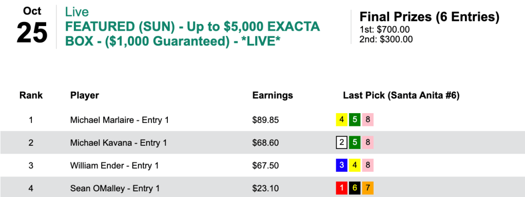 That’s because only 6 signed up for Sunday’s $1,000 Guaranteed Exacta tourney. So $1,000 was paid out while only $750 was taken in (a 33% player overlay if you’re scoring at home). Marlaire’s 3 winners, which included a $48.45 collection for a dollar in the 10th at Woodbine, earned him the $700 top prize.
