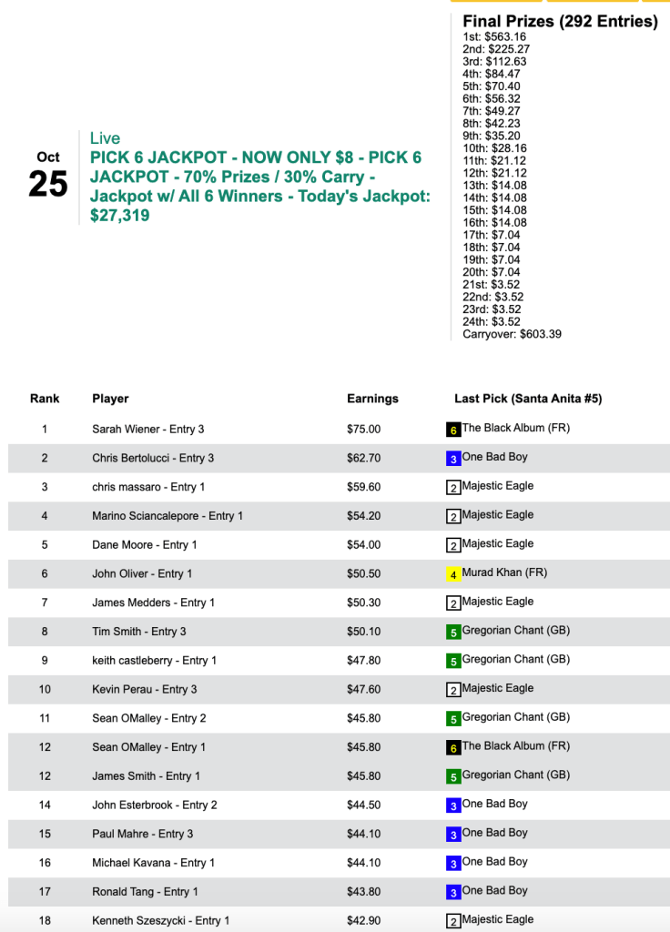On Thursday, Yurczyk finished first in a Santa Anita Closing Day qualifier. Then on Friday, he padded his bank account by having a Christopher Fischer-like day (1 win, 4 places) in our $10,000 Guaranteed Pick & Pray. Yurczyk did it in reverse, though, coming up with a 9-1 winner right out of the gate, then supplementing it with 4 place cashers thereafter. For his efforts, Yurczyk received $6,483 out of a final total purse of $12,967.