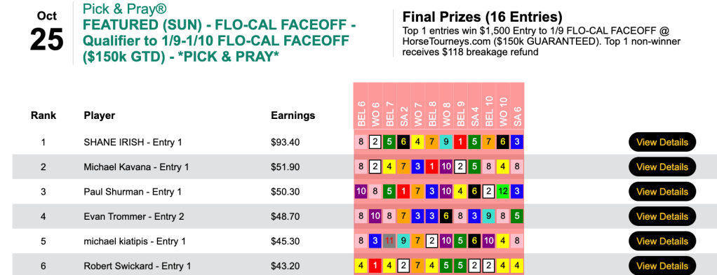 The Santa Anita 7-1 shot protected Irish’s lead (and bumped it up to $41.50) as Shane collected a $1,500 Flo-Cal Faceoff entry.