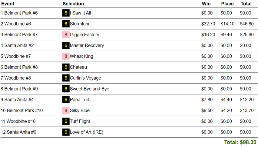 West whiffed on the final five races…but he had 2 wins and 4 places in the 7 before that to walk away with the $10,000 seat. His big hit came with Desolator ($45.60, $18.80) in the 7th at Woodbine.