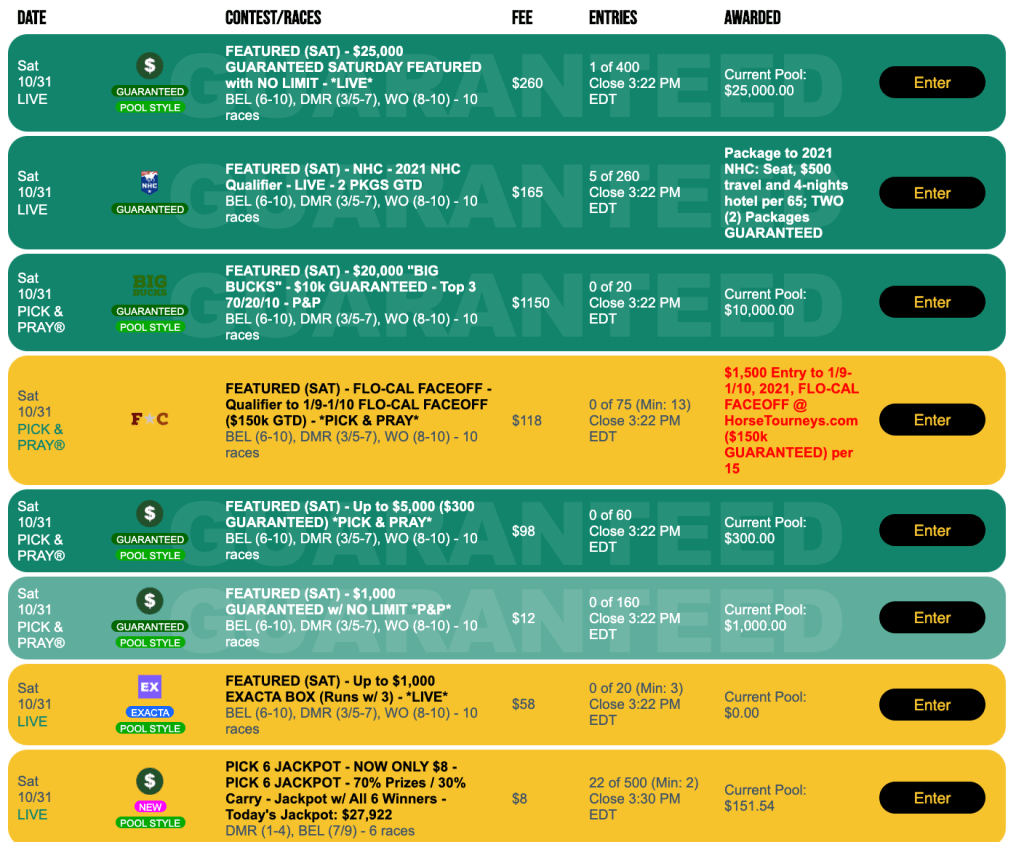 The $8 Pick 6 Jackpot keeps growing and growing. Saturday’s will start out at $27,922. That amount—plus whatever is generated on Saturday—will be won or shared by anyone who can go 6-for-6. (This would be a really nice Halloween haul.) Seventy percent of net entry fees get paid out via traditional win/place scoring totals while 30% gets directed to the Jackpot.