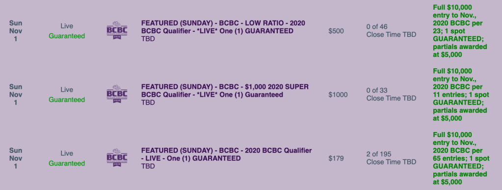 Saturday’s “regular” BCBC qualifier has one grand prize guaranteed and carries an entry fee of $179. It’s a live-format tourney with a winning ratio of 1-per-65.