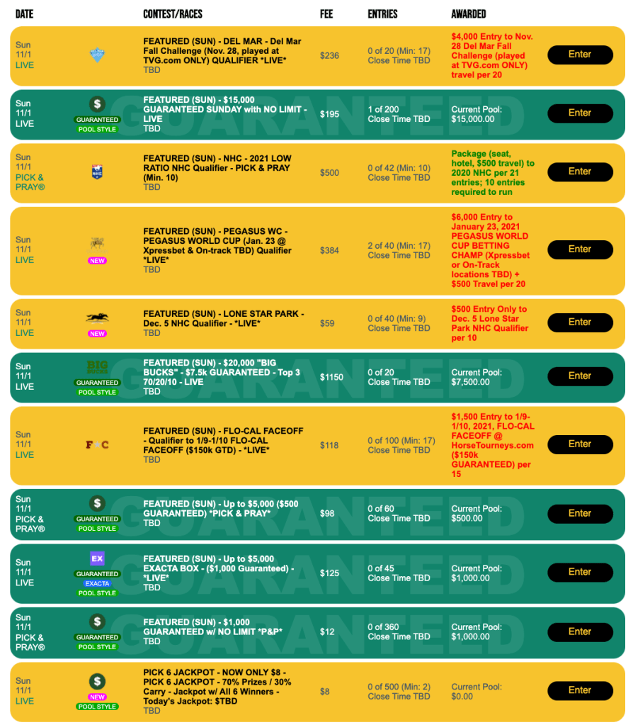A brand-new qualifying opportunity comes in the form of a $236 live-format qualifier to the Del Mar Fall Challenge on November 28. One in 20 will win a $4,000 entry to this Del Mar online competition that will be held exclusively at TVG.com. (So you have to have a TVG account by November 28th in order to participate.)
