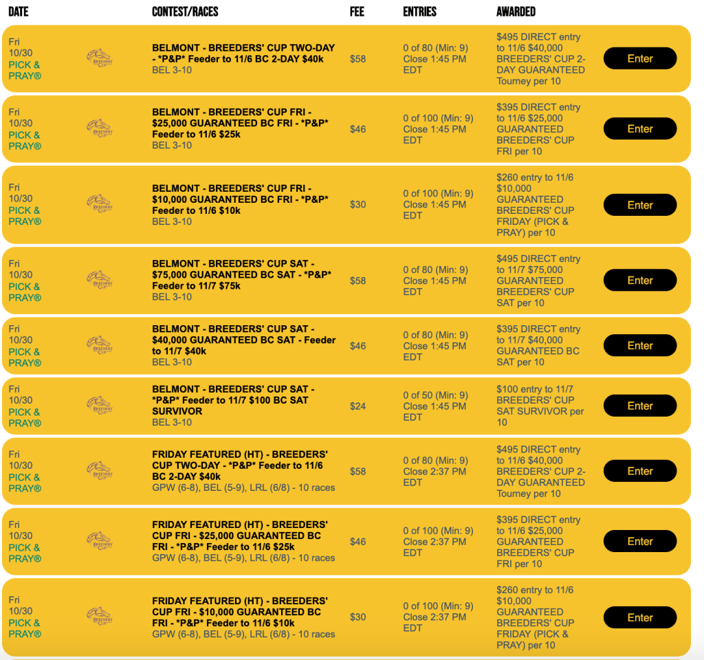 The weekend’s richest competition is Saturday’s $25,000 Guaranteed, No Limit game. An entry fee of $260 gets you into this live-format event. Win this, and you’ll feel like you’re on a roll heading into Breeders’ Cup.