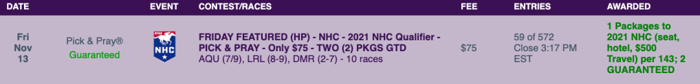 Also on a Friday/Sunday schedule this weekend are our qualifiers to the December 5th Lone Star Park NHC contest. Friday’s Pick & Pray play-in requires an entry fee of just $59, and one of every 10 entrants will pick up a $500 pass for the Texas showdown.