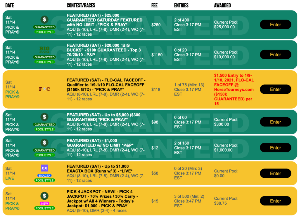 Two of our popular Saturday cash tourneys are back on Saturday after taking a week off for Breeders’ Cup.