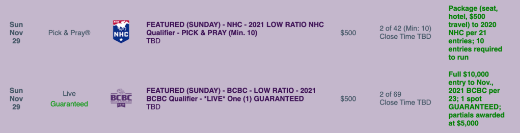 Also on the Sunday menu is a $500, Low Ratio NHC Pick & Pray. Note that there must be at least 10 entries signed on for this game to “go.”