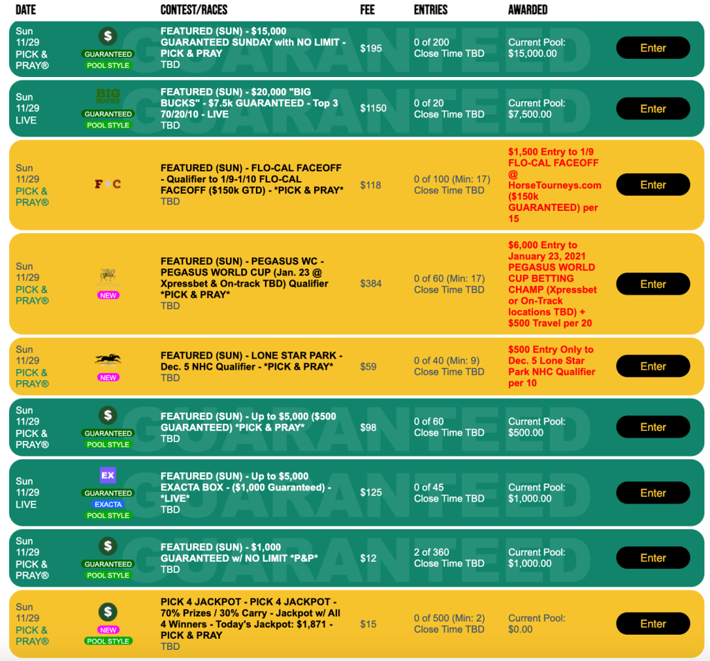 On a Thursday/Friday/Sunday qualifying schedule this weekend are our qualifiers to both the January 23rd Pegasus World Cup Betting Championship and the December 5th Lone Star Park Simulcast Challenge. The Thursday versions of these are both Pick & Prays, with the Pegasus play-in requiring an entry fee of $384. That gives you a 1-in-20 chance at a $6,500 package for the event that can be played at either Gulfstream or Xpressbet.