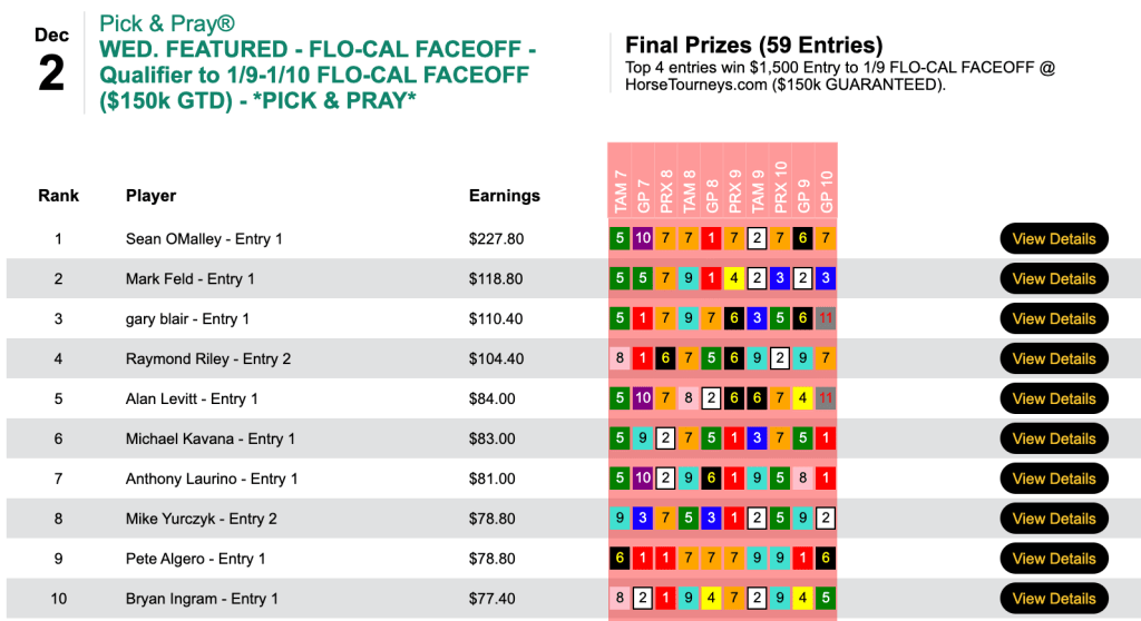 Patrick “Gino” Gianforte ultimately prevailed thanks to his 3 firsts and 3 seconds. Wolffang Wissig (4 wins, 1 place) held second, while “The Commissioner” Tim Smith (2W, 2P) snagged the final $1,500 Faceoff seat by finishing third. Each of the top three had Proud Emma ($11.20, $3.80) in the 5th at Los Alamitos among their collections.