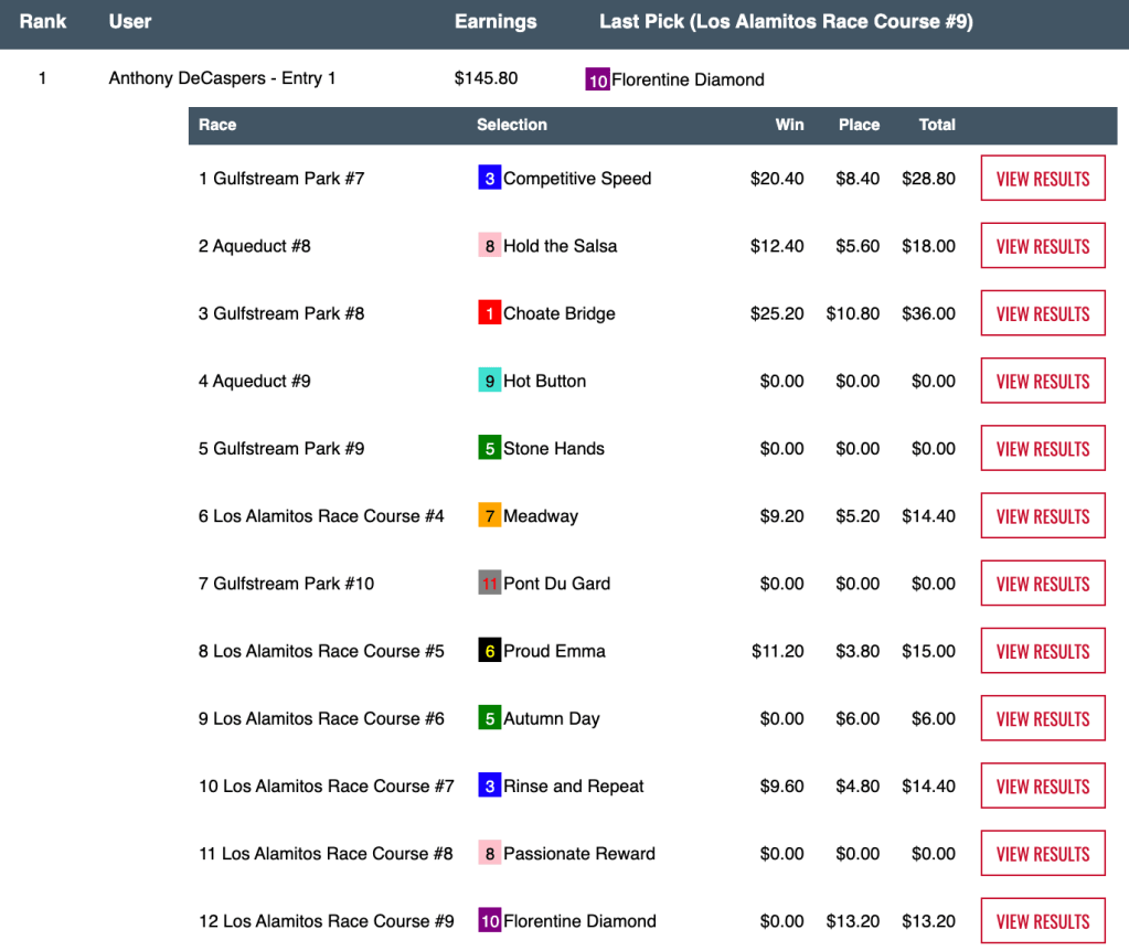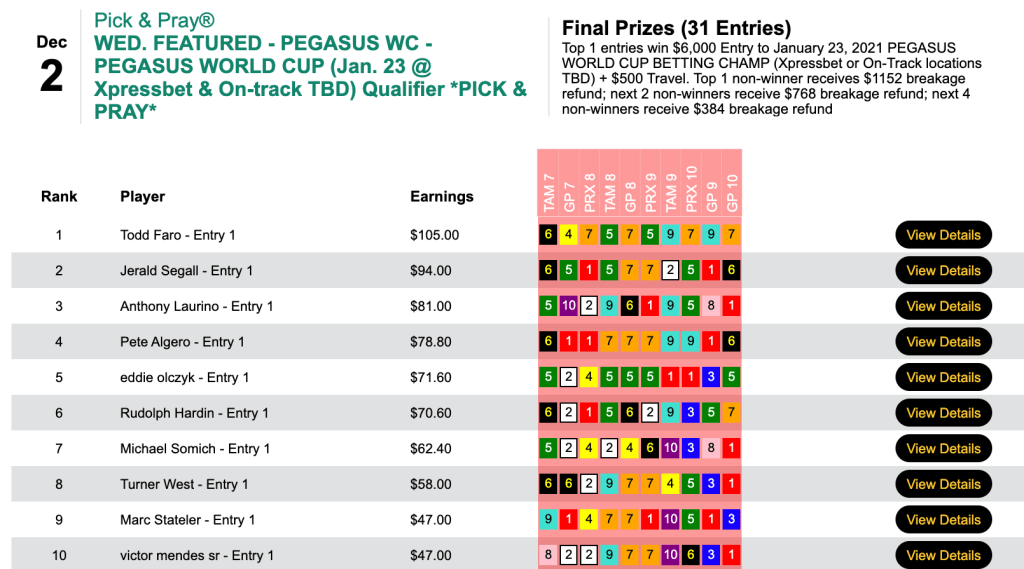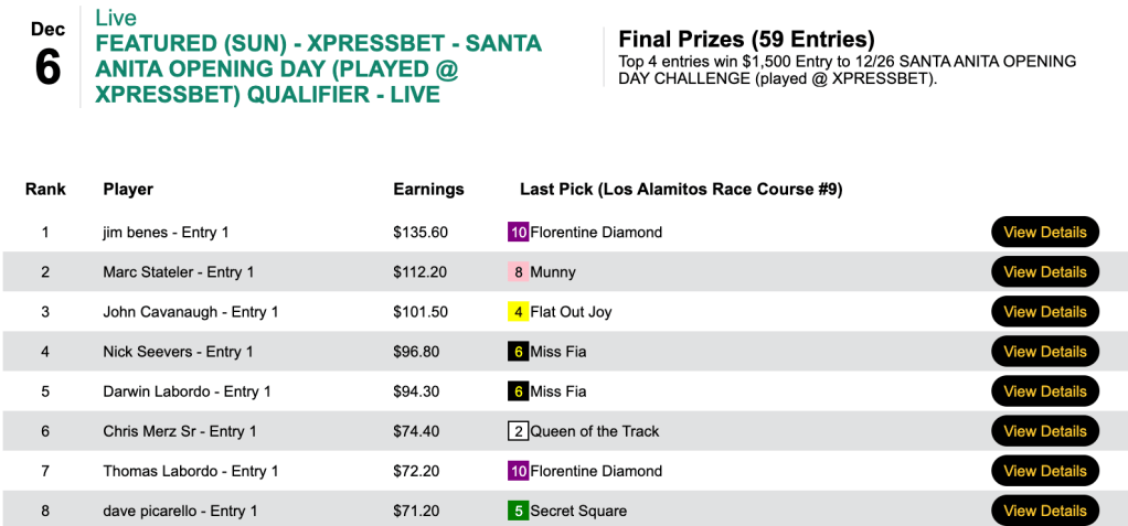 That cash game (final pot: $24,333) was a live-format tourney. However, Benes had the exact same picks in Sunday’s Pick & Pray qualifier to the Santa Anita Opening Day Challenge.