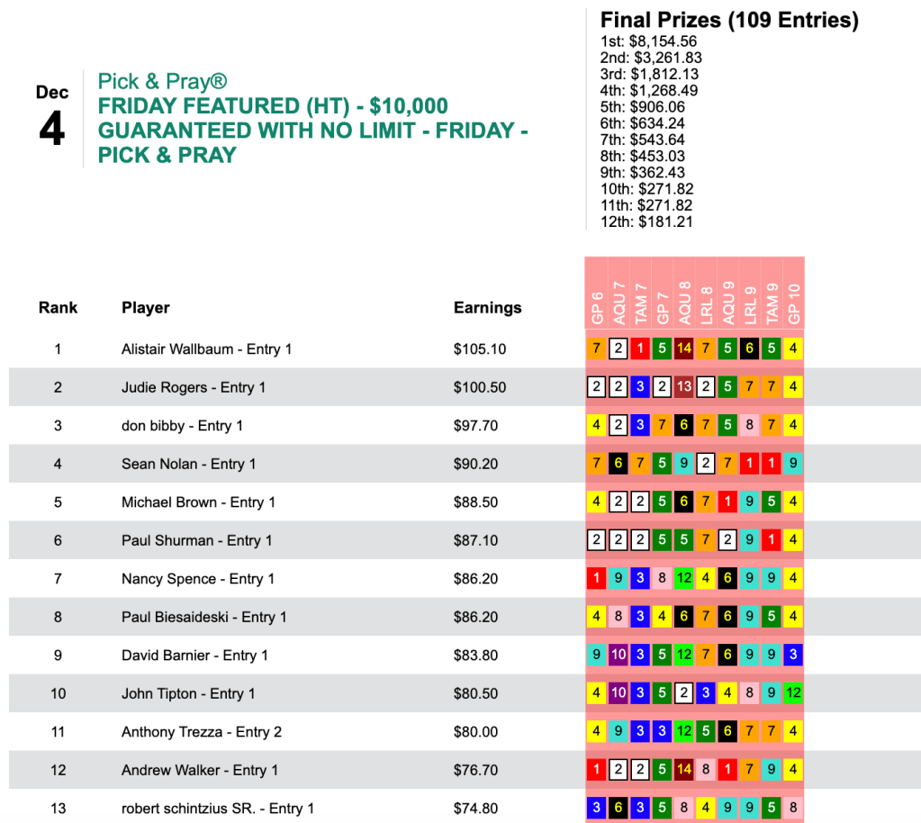 He had 4 winners out of 10 races to reign supreme in Friday’s $10,000 Guaranteed Pick & Pray, which closed with a pot of $18,121. Wallbaum’s winner’s share was $8,154.