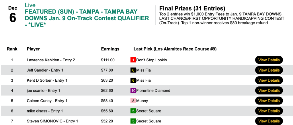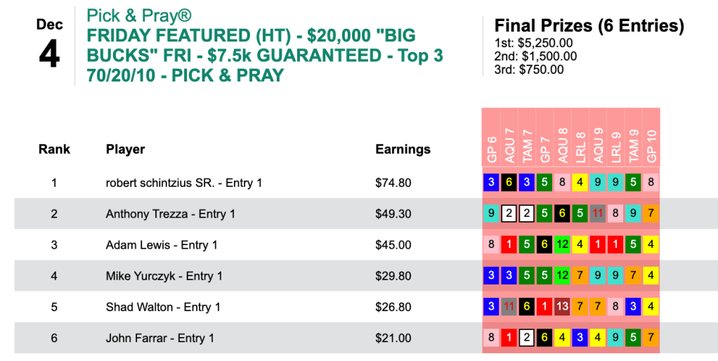 On Thanksgiving, Schintzius won $8,930 in the featured turkey day cash tourney. Two day’s later he grabbed another $12,823 in a Big Bucks game plus a Flo-Cal Faceoff entry. This time, Schintzius returned to the Big Bucks ranks to cash for another $5,250. His big horse among 3 winners was 22-1 Tampa bomb Poseidons Heir.
