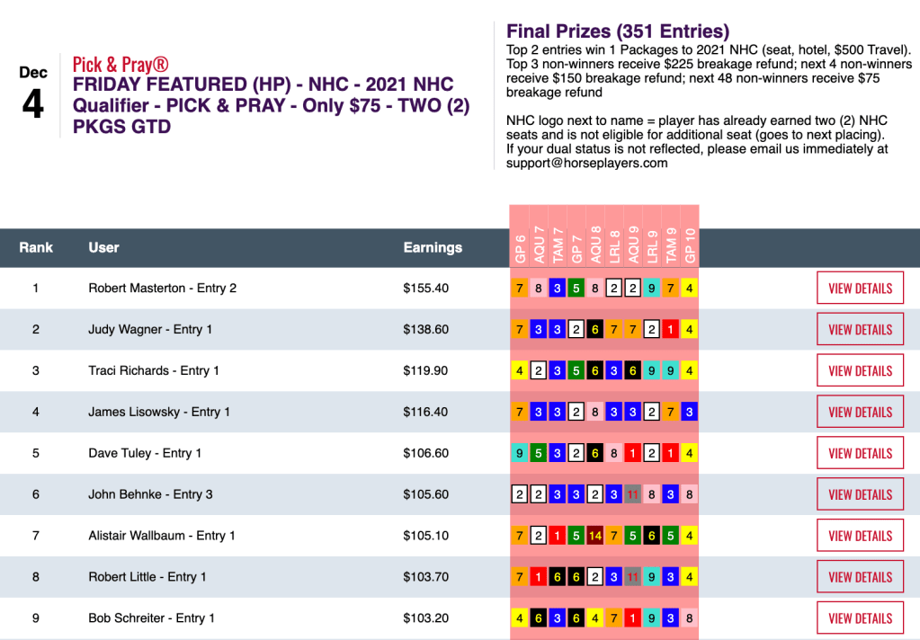 On Friday, the First Lady of the NHC earned a return ticket to the big dance by besting all but Robert Masterton in the 351-entry, $75 qualifier at HorsePlayers. Wagner can, thus, become the event’s first two-time winner next year. She did it by coming up with 3 firsts, including Cuate at 41-1 in the 6th at Gulfstream and Poseidons Heir (22-1) in the 7th at Gulfstream.