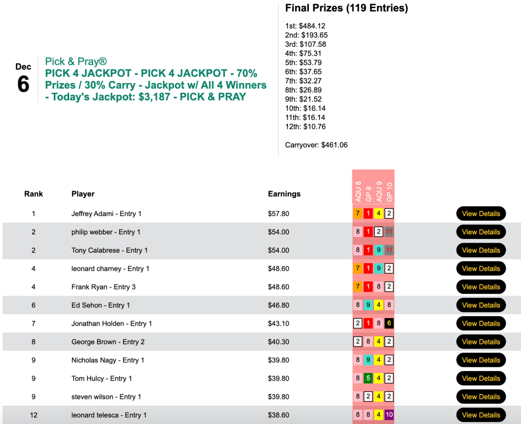 Alas, no one went 4-for-4 on this day either. Jeffrey Adami did sweep the final three races to take top honors. The lack of any perfect Pick & Pray Pick 4 tickets, however, means that Saturday’s $15 Pick 4 Jackpot will being at $3,648.