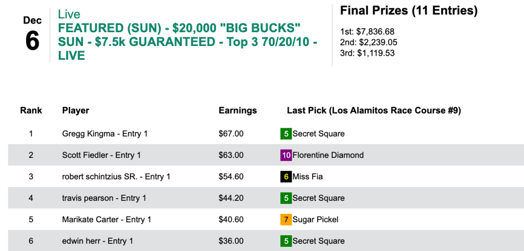 Sunday’s $1,000 Guaranteed Exacta tourney went off with 8 contestants paying $125 each. That meant no takeout to the players.