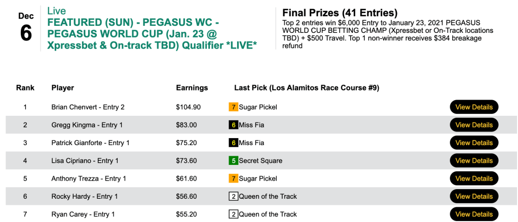 Those four collections gave him the winning total of $92.20 and earned him a $6,500 package ($6,000 bankroll plus $500 for travel) to the Pegasus World Cup Betting Championship on January 23rd. Siegel has the option of participating from either Gulfstream or Xpressbet.