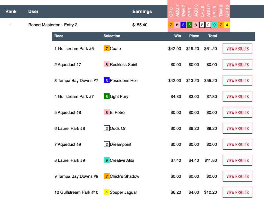 And let’s not give short shrift to Masterton. He registered the high score of the day, landing on both of Wagner’s big winners and then some.