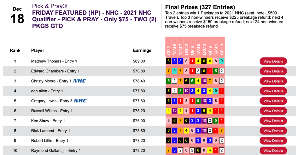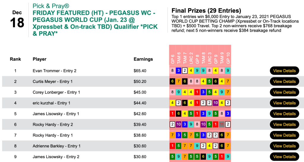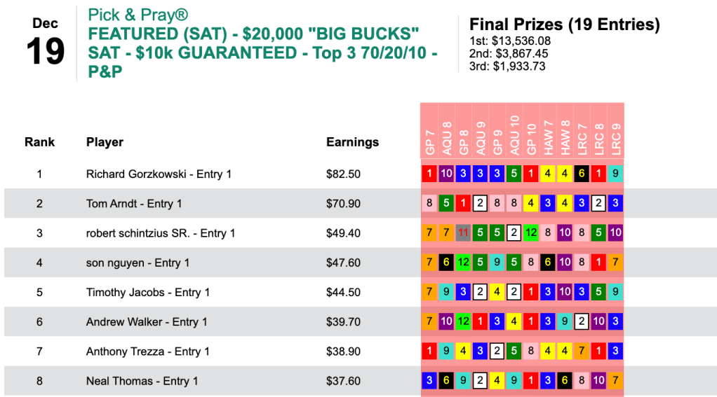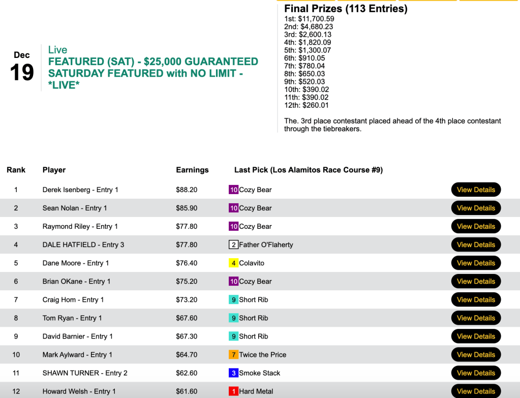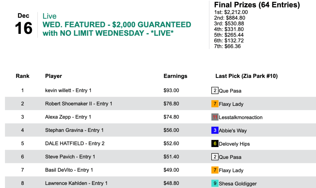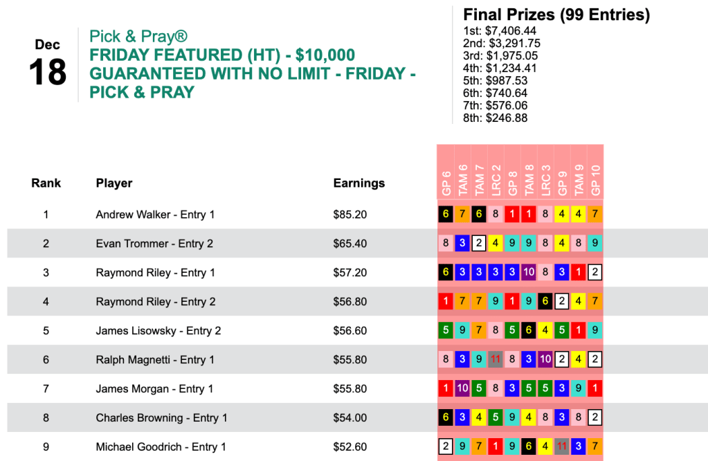 That one was among 4 winners and 2 runners up that earned Walker the biggest prize of the day…$7,406…in Friday’s $10,000 Guaranteed Pick & Pray, which had a final closing purse of $16,458.