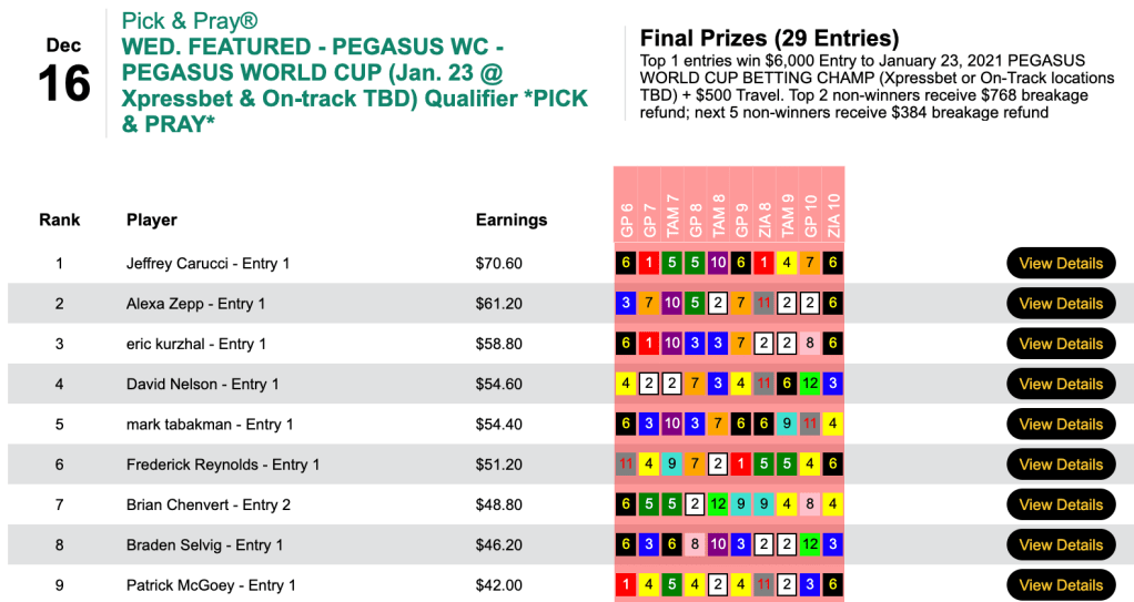 One of the most anticipated live-bankroll tournaments of the year is the Pegasus World Cup Betting Championship on January 23rd at Gulfstream/Xpressbet. In the field will be Jeffrey Carucci.