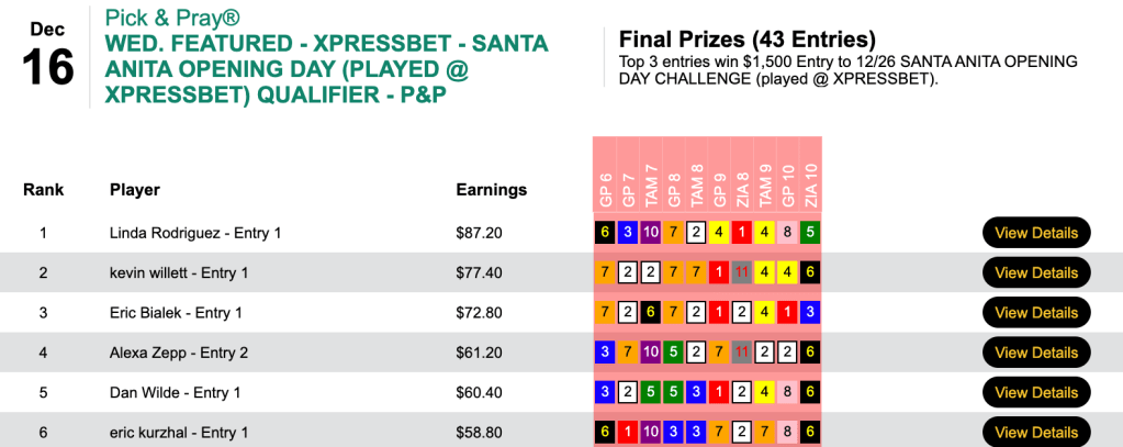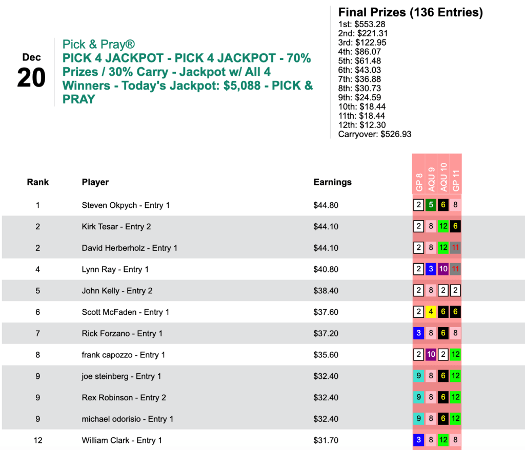 And alas, no one went 4-for-4 in the Sunday Jackpot Pick 4 tourney that Steven Okpych won with 2 winners.