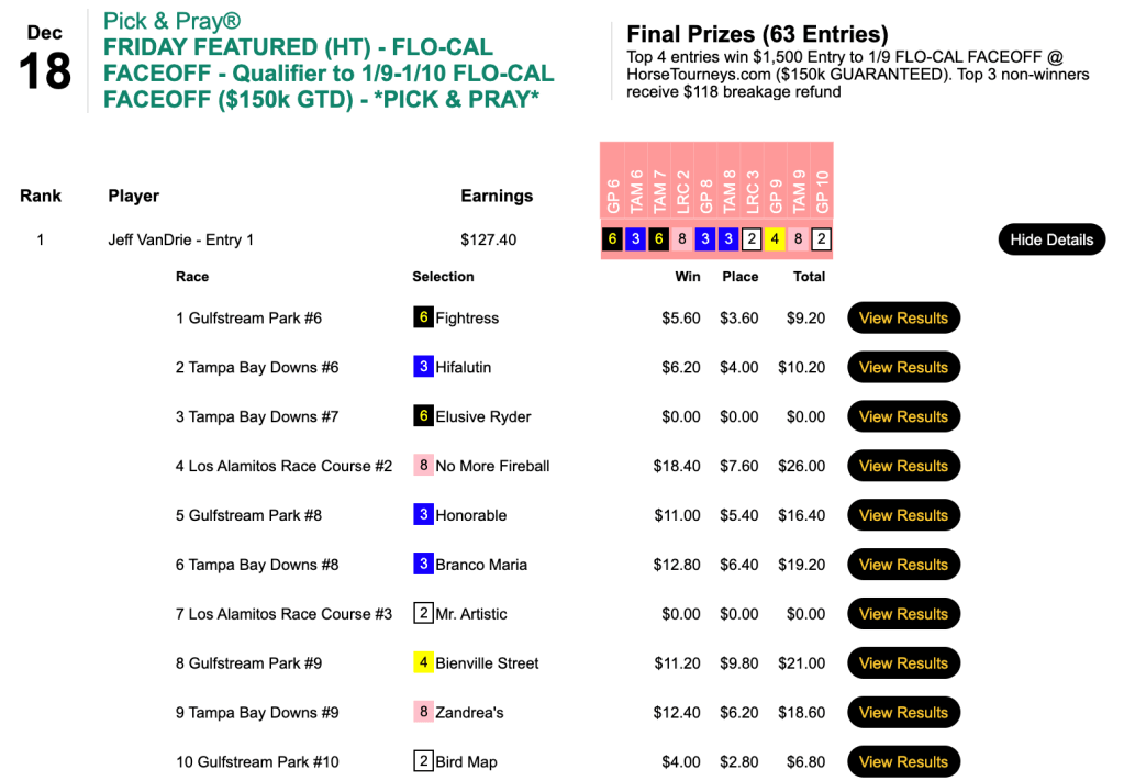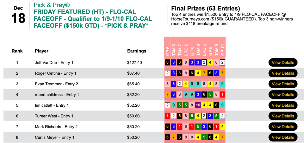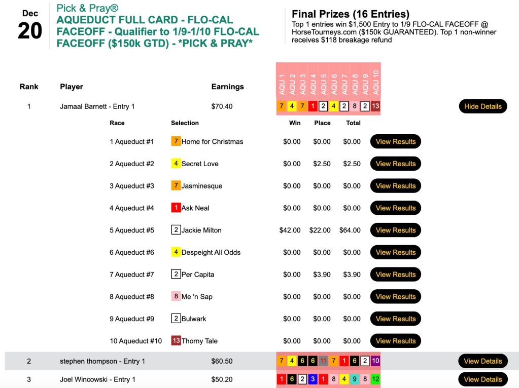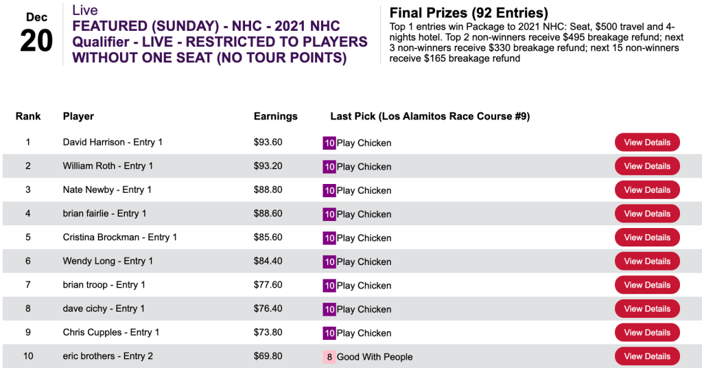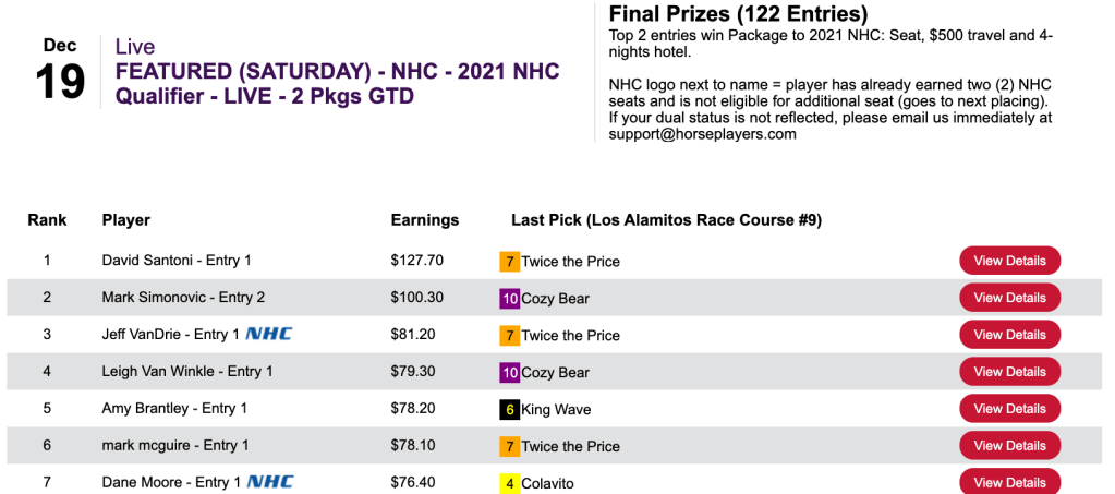The Los Alamitos 8-1 shot helped propel Thomas (5 wins, 1 place) and Chambers (4W, 1P) to the NHC in Friday’s $75 qualifier. The two also combined to have both winners of the 9th at Gulfstream…which ended in a dead heat.