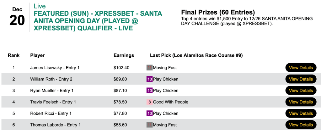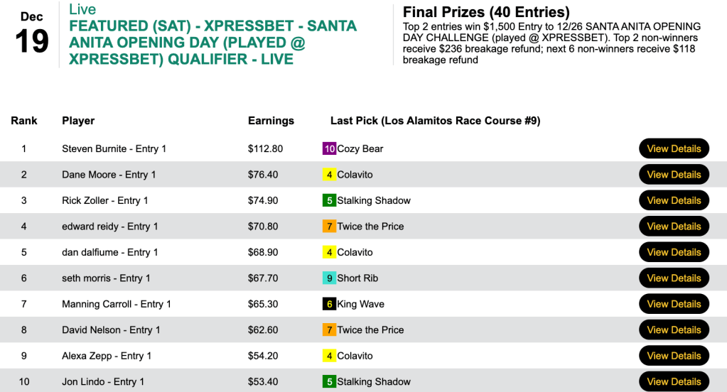 Burnite finished with 4 wins and 3 places and picked up a $1,500 entry on Saturday to the December 26th Santa Anita Opening Day Challenge to be held at Xpressbet. Last chances to qualify come up later this week.