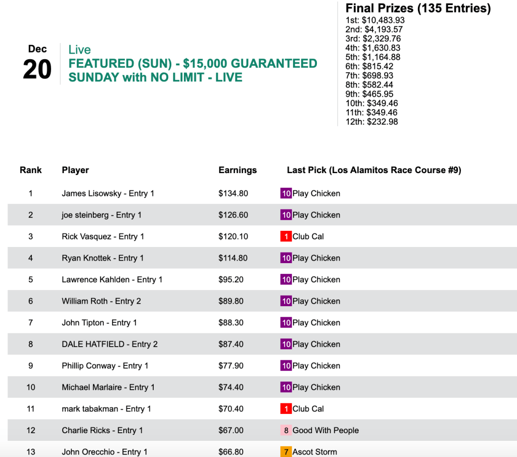Like Lisowsky, Roth and Eric Gielata, many Sunday winners got what they got thanks to having not just Play Chicken in the last contest race (race 9) at Los Alamitos, but also Royal Act ($13.40, 6.20) in the race before that at Los Al. That was the case with David Harrison at HorsePlayers.